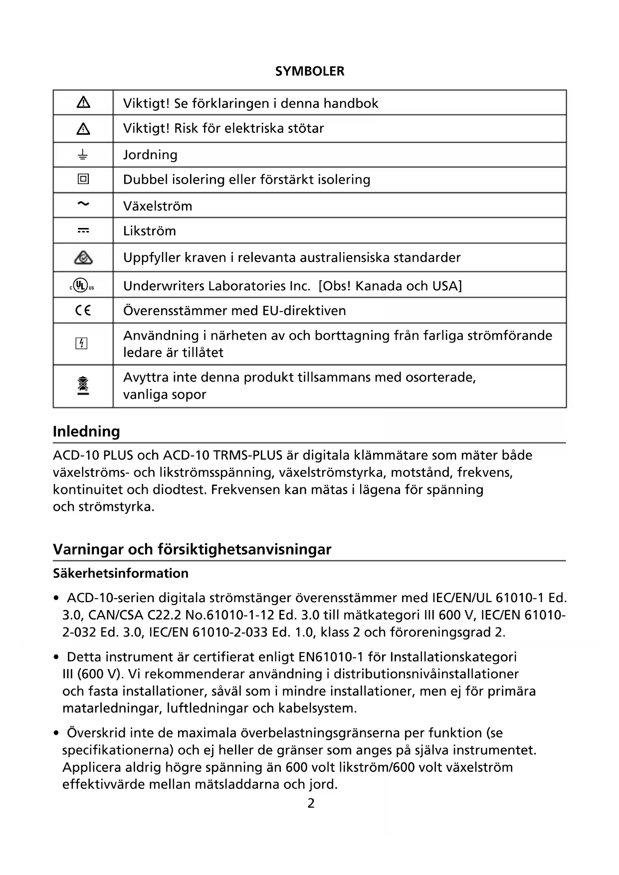 Avyttra inte denna produkt tillsammans med osorterade, vanliga sopor Inledning ACD-10 PLUS och ACD-10 TRMS-PLUS är digitala klämmätare som mäter både växelströms- och likströmsspänning, växelströmstyrka, motstånd, frekvens, kontinuitet och diodtest. Frekvensen kan mätas i lägena för spänning och strömstyrka. Varningar och försiktighetsanvisningar Säkerhetsinformation