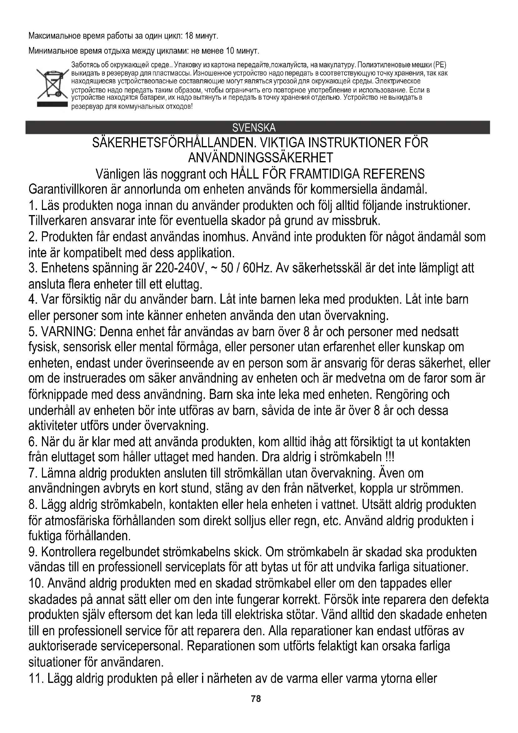TEKNISK DATA Strömförsörjning: 220-240V ~ 50/60Hz Effekt: 600W Max effekt: 2000W Max driftstid i en cykel: 18 minuter. Minsta vilotid mellan cyklerna: minst 10 minuter.82 Vi sköter om miljön. Överlämna förpackningar i kartong till pappersavfall. Polyetylensäckar (PE) slängs i avfallsbehållare för plast. Man bör lämna en gammal apparat till en riktig återvinningscentral, eftersom farliga komponenter i apparaten kan orsaka fara till miljön. En elektrisk apparat bör lämnas för att minska förnyad användning av denna. Om apparaten innehåller batterier, bör man ta bort dem och lämna dem separat till återvinningscentraler. SLOVENSKÝ BEZPEČNOSTNÉ PODMIENKY. DÔLEŽITÉ POKYNY K BEZPEČNOSTI POUŽÍVANIA PROSÍM ČÍTAJTE POZORNE A USCHOVAJTE SI BUDÚCE REFERENCIE Pokiaľ sa zariadenie používa na komerčné účely, záručné podmienky sú odlišné.
