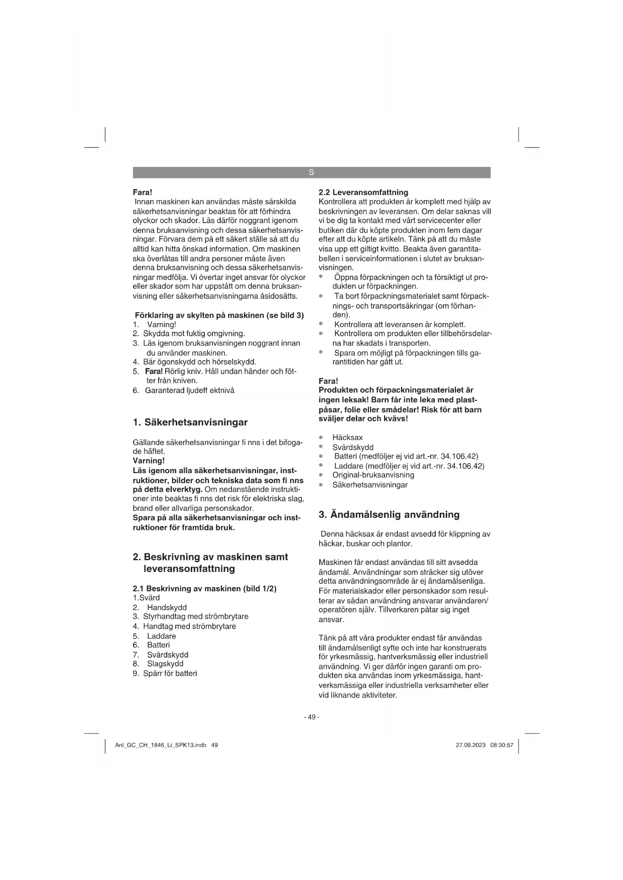 Denna häcksax är endast avsedd för klippning av häckar, buskar och plantor. Maskinen får endast användas till sitt avsedda ändamål. Användningar som sträcker sig utöver detta användningsområde är ej ändamålsenliga. För materialskador eller personskador som resul- terar av sådan användning ansvarar användaren/ operatören själv. Tillverkaren påtar sig inget ansvar. Tänk på att våra produkter endast får användas till ändamålsenligt syfte och inte har konstruerats för yrkesmässig, hantverksmässig eller industriell användning. Vi ger därför ingen garanti om pro- dukten ska användas inom yrkesmässiga, hant- verksmässiga eller industriella verksamheter eller vid liknande aktiviteter. Anl_GC_CH_1846_Li_SPK13.indb 49Anl_GC_CH_1846_Li_SPK13.indb 49 27.09.2023 08:30:5727.09.2023 08:30:57S