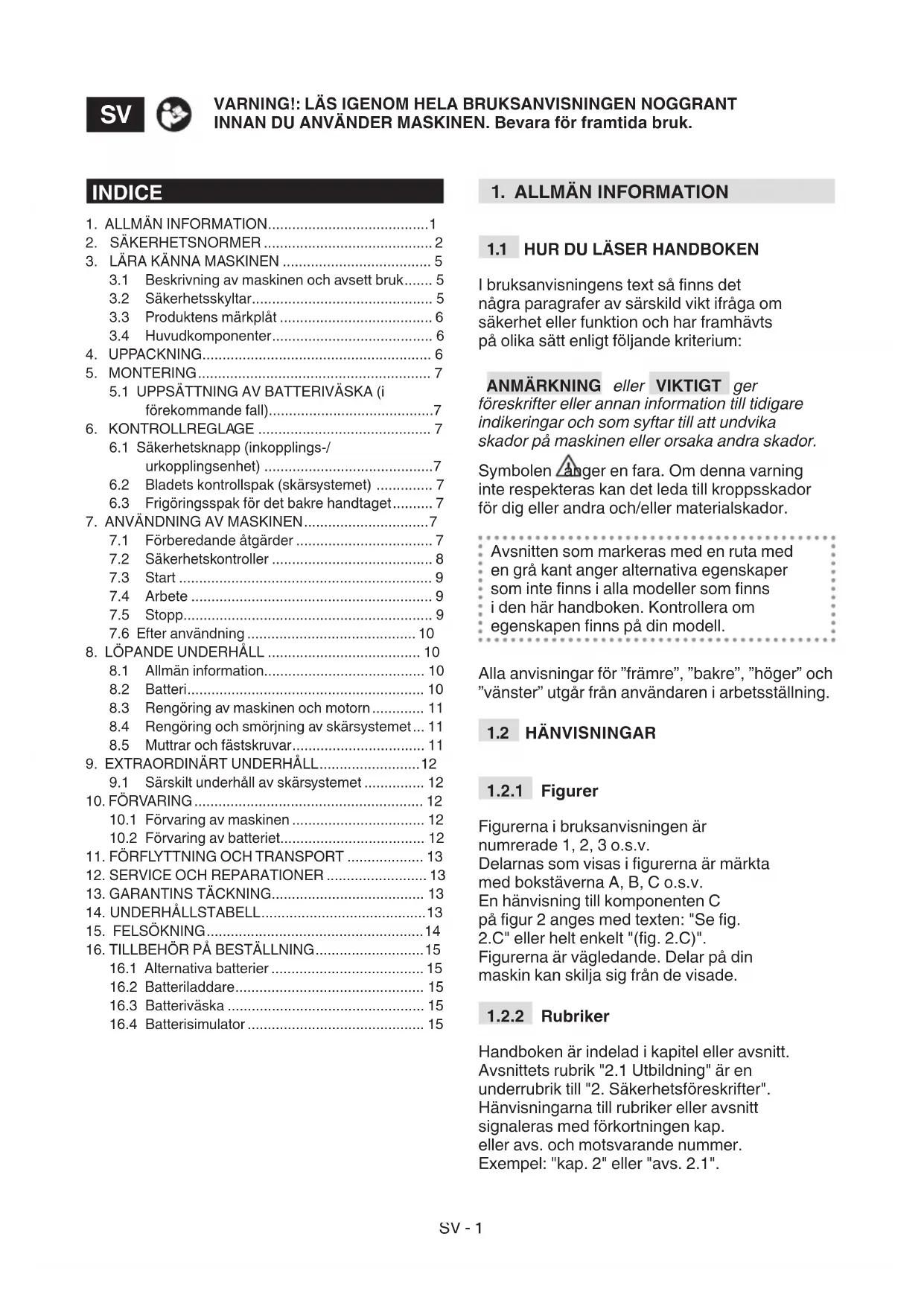 Den här handboken ger alla anvisningar som behövs för att använda maskinen och för ett korrekt löpande underhåll som kan utföras av användaren. Allt justeringsarbete och underhållsarbete som inte beskrivs i denna bruksanvisning ska utföras hos din återförsäljare eller en specialiserad serviceverkstad som har tillräcklig kunskap och nödvändiga verktyg för att utföra ett korrekt arbete och bibehålla maskinens ursprungliga säkerhet. Ingrepp som utförs av olämpliga strukturer eller av ej kvalicerade personer medför att all slags garanti, tillverkarens förpliktelse eller ansvar upphör att gälla.