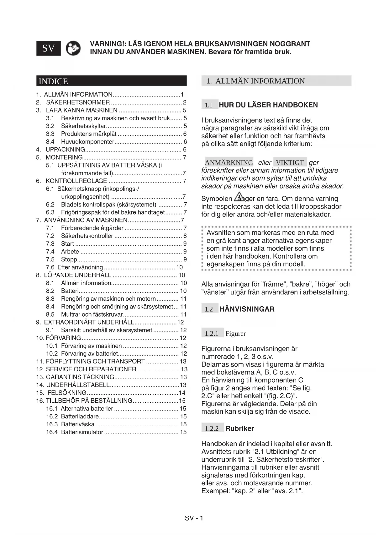 Handboken är indelad i kapitel eller avsnitt. Avsnittets rubrik "2.1 Utbildning" är en underrubrik till "2. Säkerhetsföreskrifter". Hänvisningarna till rubriker eller avsnitt signaleras med förkortningen kap. eller avs. och motsvarande nummer. Exempel: "kap. 2" eller "avs. 2.1". INDICE