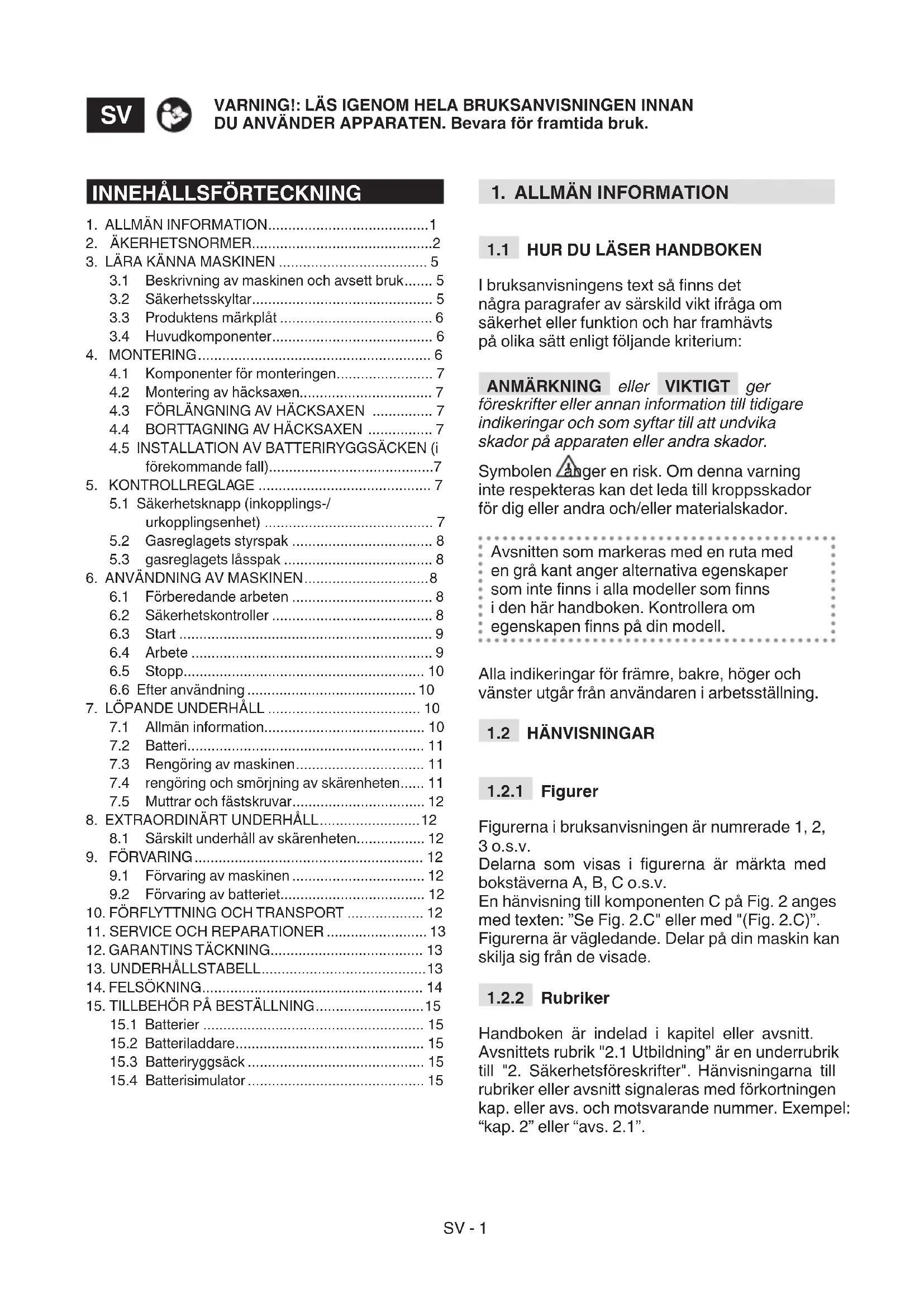 [18] Batterienhet, mod. [19] Batteriladdare [20] Batteriväska [21] Batterisimulator (*) Detta batteri får endast användas med Batteriväska. Det är förbjudet att sätta i batteriet i facket på maskinen. a) ANMÄRKNING: det totala angivna vibrationsvärdet har mätts i enlighet med en standardiserad testmetod och kan användas för en jämförelse mellan olika verktyg. Det totala vibrationsvärdet kan användas även vid en preliminär exponeringsbedömning. b) VARNING: vibrationsemissioner under användningen av verktyget kan skilja sig från det totala värdet som anges beroende på hur verktyget används. Därför är det nödvändigt, under arbetet, att tillämpa de följande säkerhetsåtgärderna som avses för att skydda föraren: bär handskar under användningen, begränsa användningstiden och tiderna som gasreglagets spak hålls nedtryckt.