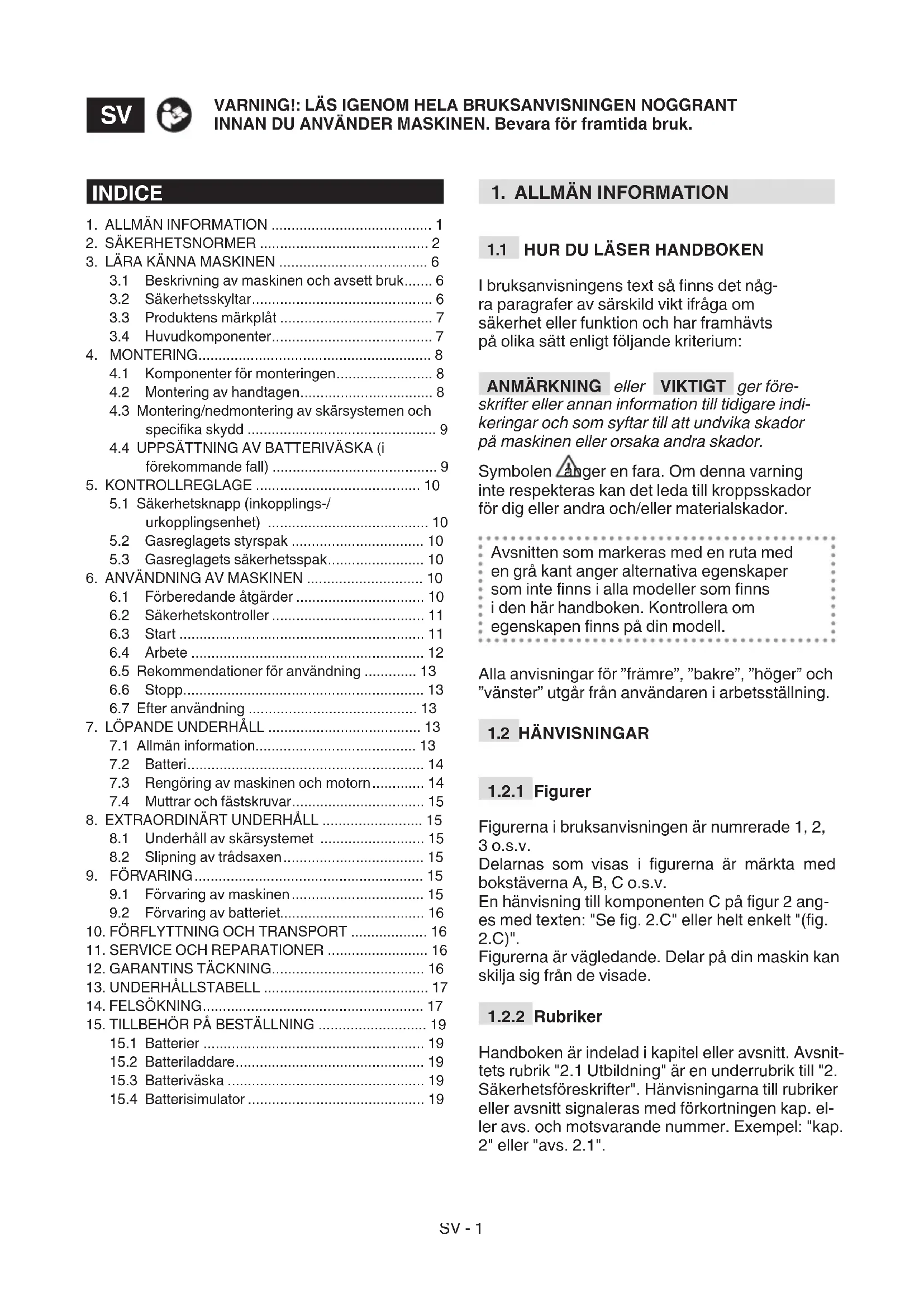 VIKTIGT följande säkerhetsnormer omfattar säkerhetsföreskrifter i batteriets och batteriladda- rens bruksanvisning som bifogats maskinen.