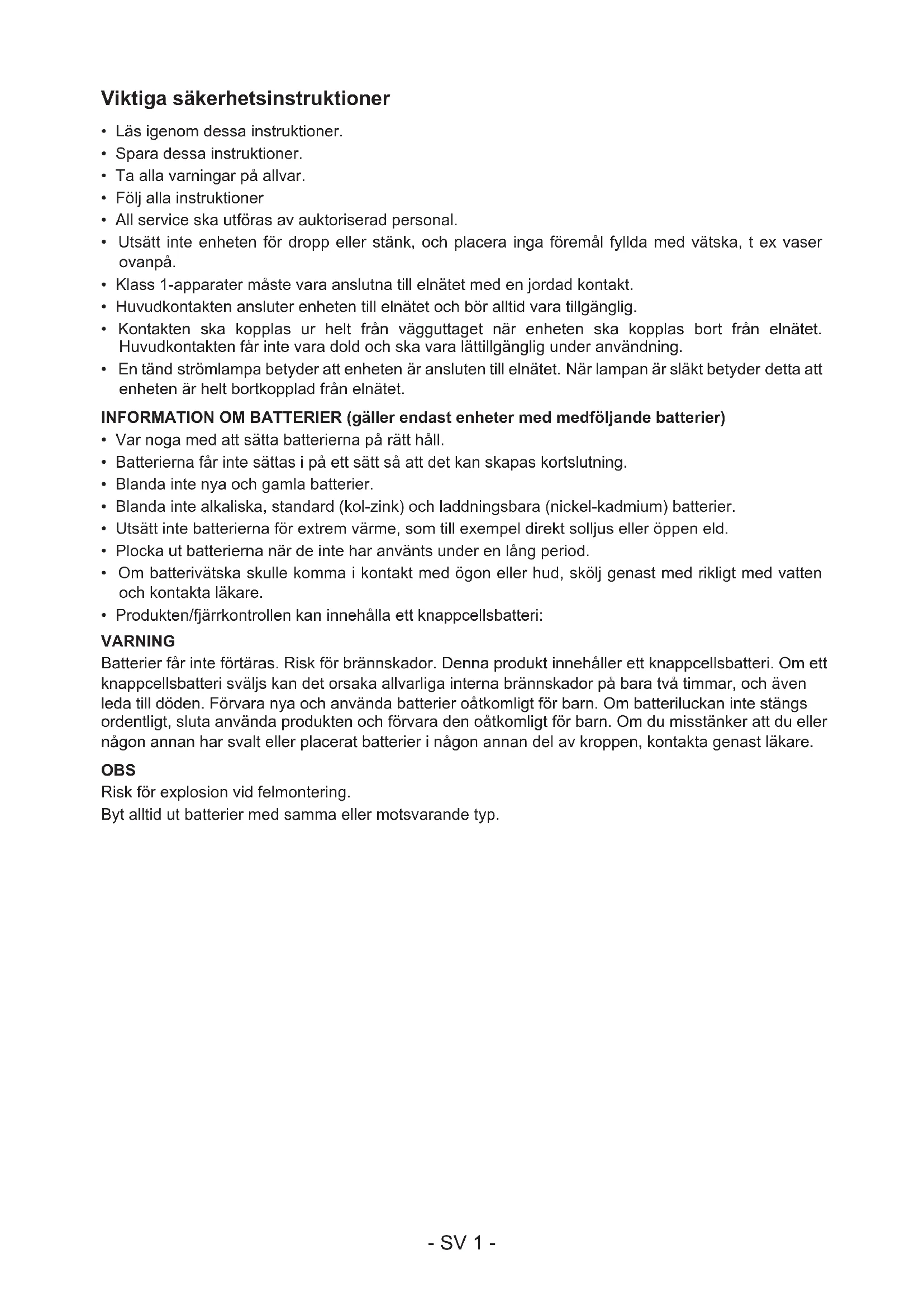 - En tänd strömlampa betyder att enheten är ansluten till elnätet. När lampan är släkt betyder detta att enheten är helt bortkopplad från elnätet. INFORMATION OM BATTERIER (gäller endast enheter med medföljande batterier)