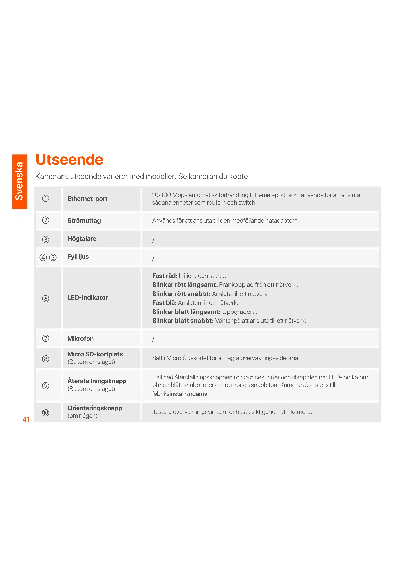 Används för att ansluta till den medföljande nätadaptern. 10/100 Mbps automatisk förhandling Ethernet-port, som används för att ansluta sådana enheter som routern och switch. Fast röd: Initiera och starta. Blinkar rött långsamt: Frånkopplad från ett nätverk. Blinkar rött snabbt: Ansluta till ett nätverk. Fast blå: Ansluten till ett nätverk. Blinkar blått långsamt: Uppgradera. Blinkar blått snabbt: Väntar på att ansluta till ett nätverk. Sätt i Micro SD-kortet för att lagra övervakningsvideorna. Håll ned återställningsknappen i cirka 5 sekunder och släpp den när LED-indikatorn blinkar blått snabbt eller om du hör en snabb ton. Kameran återställs till fabriksinställningarna. Justera övervakningsvinkeln för bästa sikt genom din kamera. Fyll ljus LED-indikator Mikrofon Högtalare