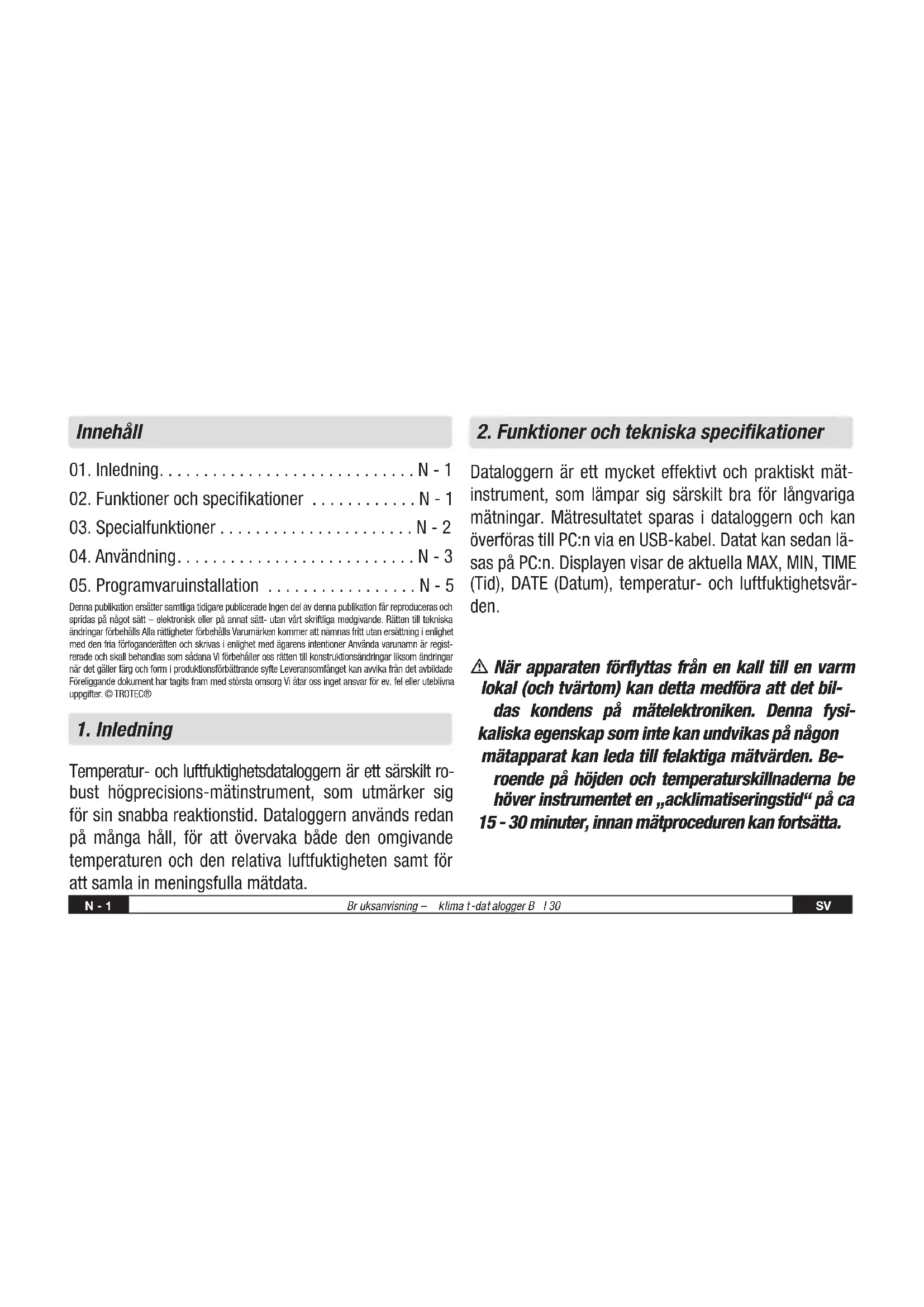 TRO-TR-BA-BL30-HS-002-INT - Kopie.indd 1 08.09.2014 10:20:16SV Br uksanvisning – klima t-dat alogger B l 30 N - 2 m Se till att datalogger alltid används/förvaras upp- rätt. Detta gäller även efter mätningar, som genom- förts i låga temperaturer eller i miljöer med hög luftfuktighet. På så sätt undviker man åtminsto- ne, att det kondensvatten som bildats inte samlas i apparaten, utan att det kan försvinna genom ap- paratens undre del. Vänta tills den fukt som bildats inuti apparaten på grund av fysikaliska processer har avdunstat helt, innan det ihopsamlade datat kan utvärderas. För att spara batteri, kan data- loggern kopplas direkt till PC:n via USB. Under denna omkopplingstid får den ström direkt från PC:n.