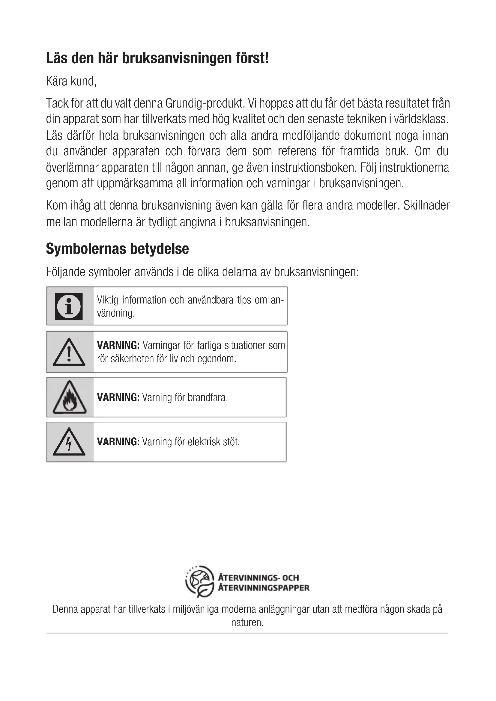 - Grundig-produkter efterlever tillämpliga säkerhetsstandarder och därför ska apparaten eller strömkabeln om den skadas, bytas eller lagas av en återför- säljare, ett servicecenter, en ex- pert eller auktoriserad service, för att undvika skada. Felaktigt eller obehörigt reparationsarbete kan orsaka fara och risker för användaren.