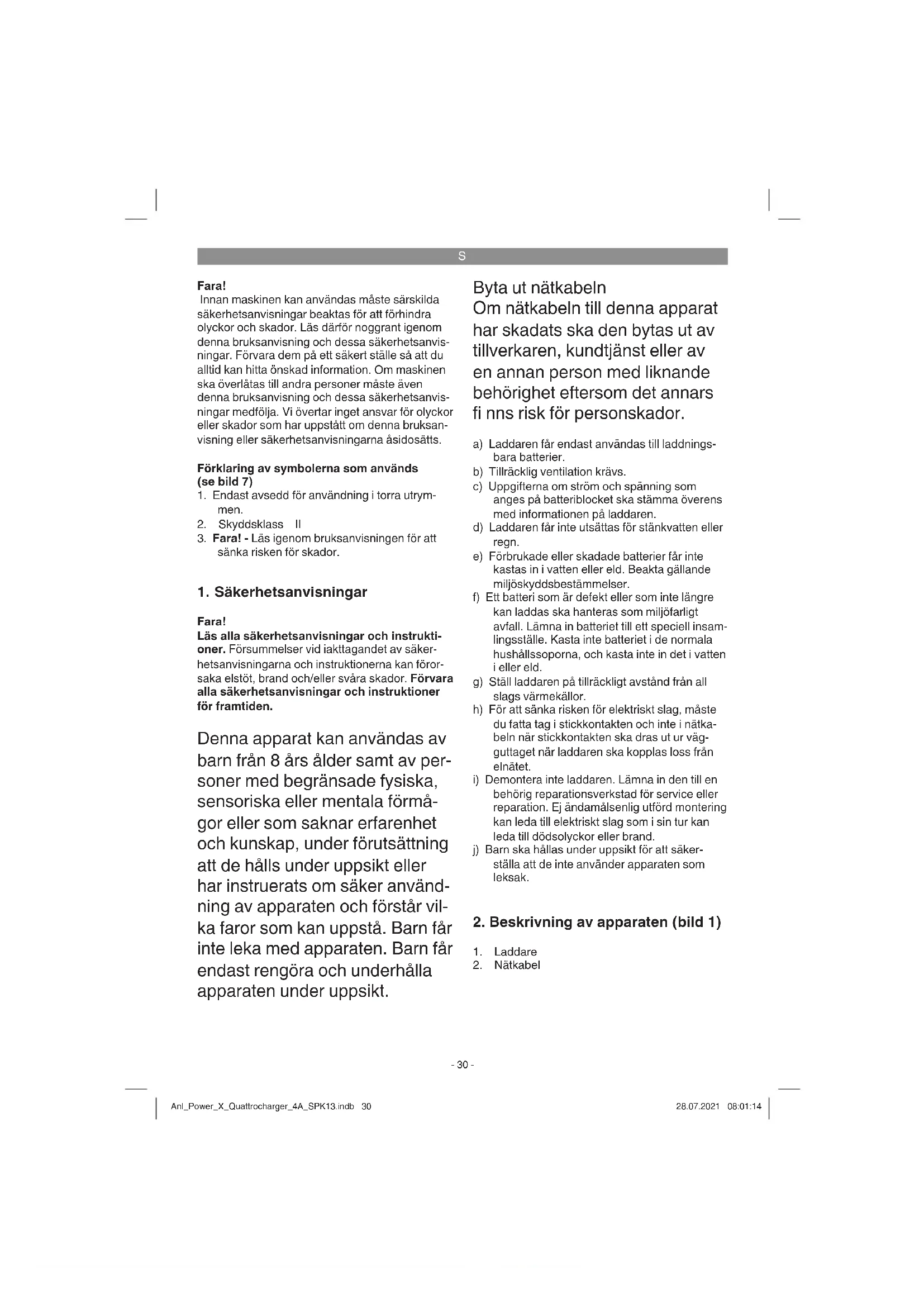 Fara! Läs alla säkerhetsanvisningar och instrukti- oner. Försummelser vid iakttagandet av säker- hetsanvisningarna och instruktionerna kan föror- saka elstöt, brand och/eller svåra skador. Förvara alla säkerhetsanvisningar och instruktioner för framtiden. Denna apparat kan användas av barn från 8 års ålder samt av per- soner med begränsade fysiska, sensoriska eller mentala förmå- gor eller som saknar erfarenhet och kunskap, under förutsättning att de hålls under uppsikt eller har instruerats om säker använd- ning av apparaten och förstår vil- ka faror som kan uppstå. Barn får inte leka med apparaten. Barn får endast rengöra och underhålla apparaten under uppsikt. Byta ut nätkabeln Om nätkabeln till denna apparat har skadats ska den bytas ut av tillverkaren, kundtjänst eller av en annan person med liknande behörighet eftersom det annars fi nns risk för personskador. a) Laddaren får endast användas till laddnings- bara batterier. b) Tillräcklig ventilation krävs. c) Uppgifterna om ström och spänning som anges på batteriblocket ska stämma överens med informationen på laddaren. d) Laddaren får inte utsättas för stänkvatten eller regn. e) Förbrukade eller skadade batterier får inte kastas in i vatten eller eld. Beakta gällande miljöskyddsbestämmelser. f) Ett batteri som är defekt eller som inte längre kan laddas ska hanteras som miljöfarligt avfall. Lämna in batteriet till ett speciell insam- lingsställe. Kasta inte batteriet i de normala hushållssoporna, och kasta inte in det i vatten i eller eld. g) Ställ laddaren på tillräckligt avstånd från all slags värmekällor. h) För att sänka risken för elektriskt slag, måste du fatta tag i stickkontakten och inte i nätka- beln när stickkontakten ska dras ut ur väg- guttaget när laddaren ska kopplas loss från elnätet.