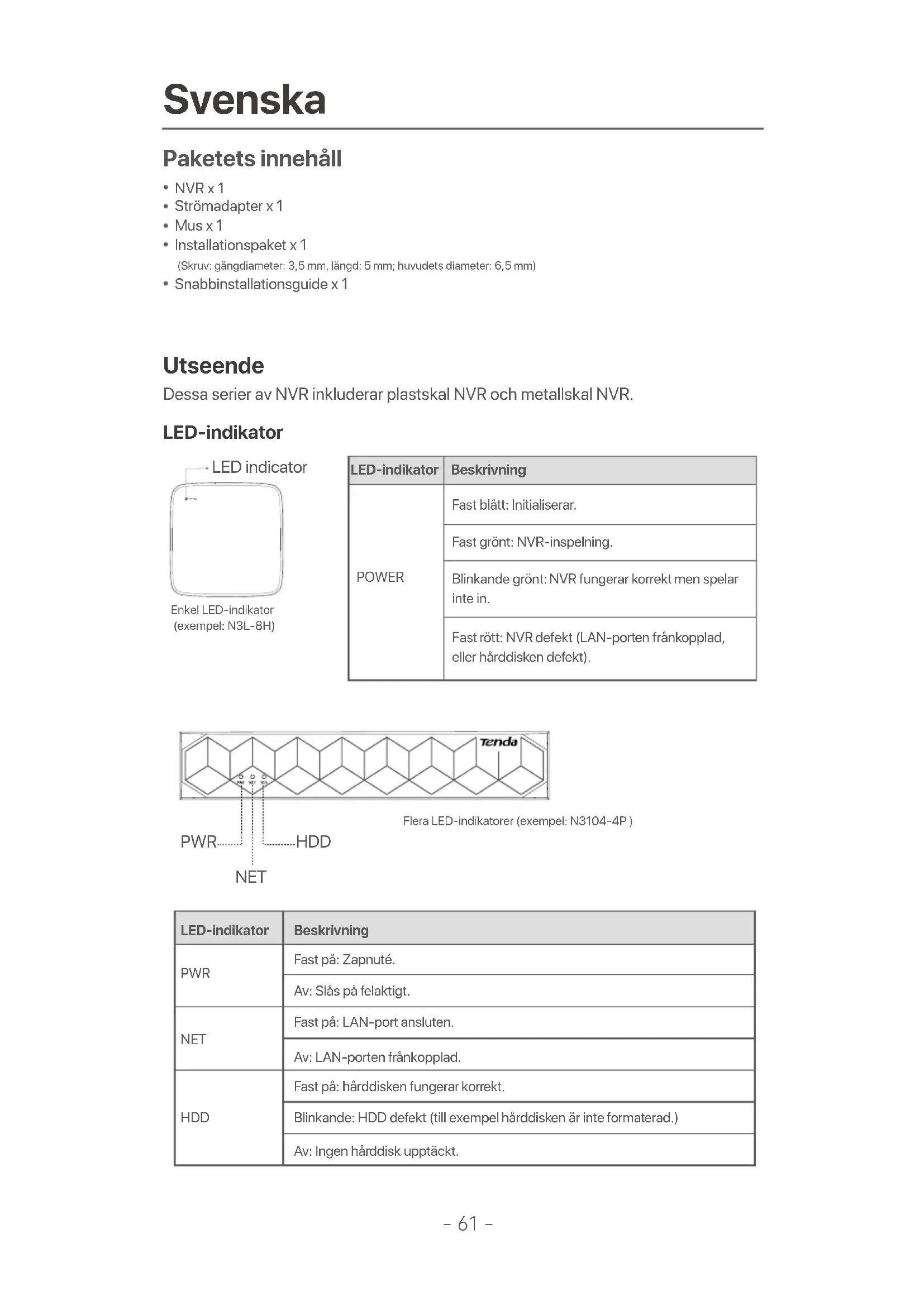- Stäng av kameran och starta om den. Q4. Vad ska jag göra om NVR inte hittar kameran? A4: Om NVR stöder PoE-porten och kameran har anslutits till PoE-porten på NVR, prova följande lösningar: - Anslut datorn och kameran till samma nätverk och aktivera kamerans DHCP-funktion (via klienthanteringsverktyg, till exempel ONVIF Device Manager eller Web UI för kameran för konfiguration). - Om kameran är en tredjepartskamera, se till att kameran stöder ONVIF, och ONVIF är aktiverat, och en administratör med användarnamnet admin har lagts till i användarlistan. Om kameran har anslutits till LAN-sidan av NVR, prova följande lösningar: - Se till att kameran fungerar korrekt och att kameran är ordentligt ansluten till strömbrytaren eller routern som är ansluten till NVR och att Ethernet-kabeln är tät. - Se till att kamerans IP-adress ligger i samma nätverkssegment som NVR: s LAN-IP-adress (via klienthanter ingsverktyg, till exempel ONIVIF Device Manager eller Web UI för kameran för konfiguration). - Om kameran är en tredjepartskamera, se till att kameran stöder ONVIF, och ONVIF är aktiverat, och en administratör med användarnamnet admin har lagts till i användarlistan. Om problemet kvarstår, kontakta Tenda teknisk support.- 71 - Slovák Obsah balenia Vzhľad NVR x 1Napájací adaptér x 1Myš x 1Inštalačný balík x 1 (Skrutka: priemer závitu: 3,5 mm, dĺžka: 5 mm; priemer hlavy: 6,5 mm)Návod na rýchlu inštaláciu x 1 LED indikátor Tieto série NVR zahŕňajú plastové NVR a kovové NVR.POWER LED indicator Jeden indikátor LED (Príklad: N3L-8H)Viaceré LED indikátory (Príklad: N3104-4P ) PWR NET HDD LED indikátor Popis POWER Svieti: ingeschakeld. Nesvieti: Nesprávne zapnuté. Bliká na zeleno: NVR funguje správne, ale nenahráva. Svieti na červeno: NVR je chybný (port LAN odpojený, alebo HDD je chybný). LED indikátor Popis PWR NET HDD Svieti: ingeschakeld. Nesvieti: Nesprávne zapnuté. Svieti: LAN port je pripojený. Nesvieti: Port LAN je odpojený. Svieti: HDD funguje správne. Bliká: HDD je chybný (napríklad HDD nie je naformátovaný.) Nesvieti: Nenašiel sa žiadny HDD.-72- Spodný panel Otvor na skrutku HDD Montážne otvory na stenu Montážne otvory na stenu Otvor na skrutku HDD Tipy Montážne otvory na stenu: Používajú sa na upevnenie zariadenia na stenu.Materiály na montáž na stenu sa pripravujú sami. Odporúčané špecifikácie plastových skrutiek a kotiev:Skrutka: priemer závitu: 3 mm, dĺžka: 14 mm; priemer hlavy: 5.2 mmPlastová kotva: vnútorný priemer: 6,0 mm; dĺžka: 26,4 mm Plastové puzdro NVR (Príklad: N3L-8H) NVR s kovovým plášťom (Príklad: N3104-4P) Zadný panel Napájací port Uzemňovacia svorka HDMI port 10/100 Mbps LAN port VGA port PoE NVR (Príklad: N3104-4P) porty USB 2.0
