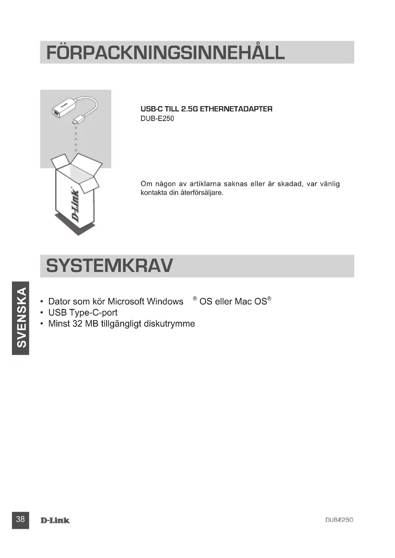 SVENSKA USB-C tILL 2.5G EthErnEtAdAptEr DUB-E250 Om någon av artiklarna saknas eller är skadad, var vänlig kontakta din återförsäljare. FÖrpACKnInGSInnEhÅLL SYStEMKrAV