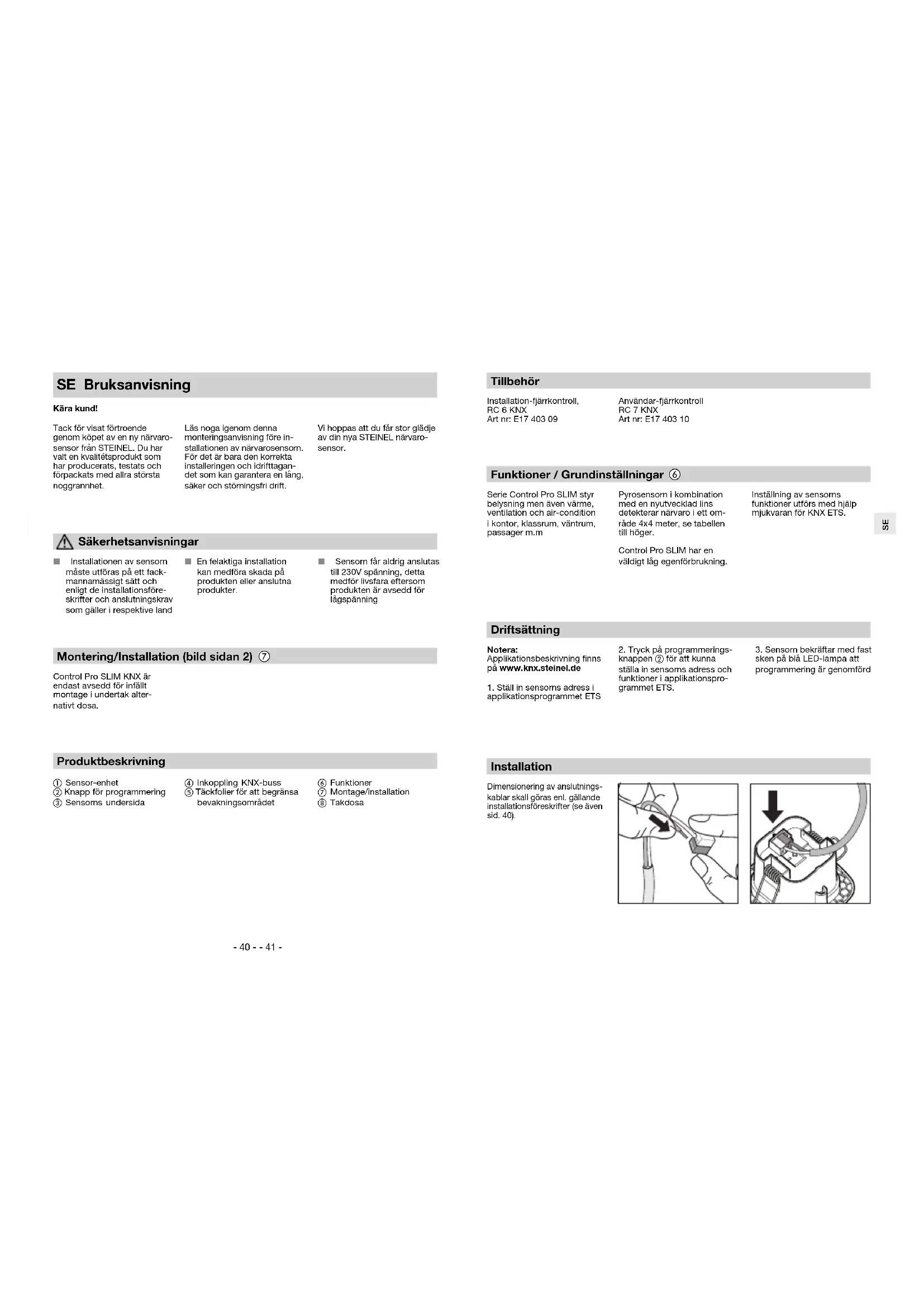 Installationen av sensorn måste utföras på ett fack- mannamässigt sätt och enligt de installationsföre- skrifter och anslutningskrav som gäller i respektive land En felaktiga installation kan medföra skada på produkten eller anslutna produkter. Sensorn får aldrig anslutas till 230V spänning, detta medför livsfara eftersom produkten är avsedd för lågspänning Produktbeskrivning Sensor-enhet Knapp för programmering Sensorns undersida Inkoppling KNX-buss Täckfolier för att begränsa bevakningsområdet Funktioner Montage/installation Takdosa Montering/Installation (bild sidan 2) Control Pro SLIM KNX är endast avsedd för infällt montage i undertak alter- nativt dosa. SE Bruksanvisning Kära kund! Tack för visat förtroende genom köpet av en ny närvaro- sensor från STEINEL. Du har valt en kvalitétsprodukt som har producerats, testats och förpackats med allra största noggrannhet. Läs noga igenom denna monteringsanvisning före in- stallationen av närvarosensorn. För det är bara den korrekta installeringen och idrifttagan- det som kan garantera en lång, säker och störningsfri drift. Vi hoppas att du får stor glädje av din nya STEINEL närvaro- sensor. Säkerhetsanvisningar