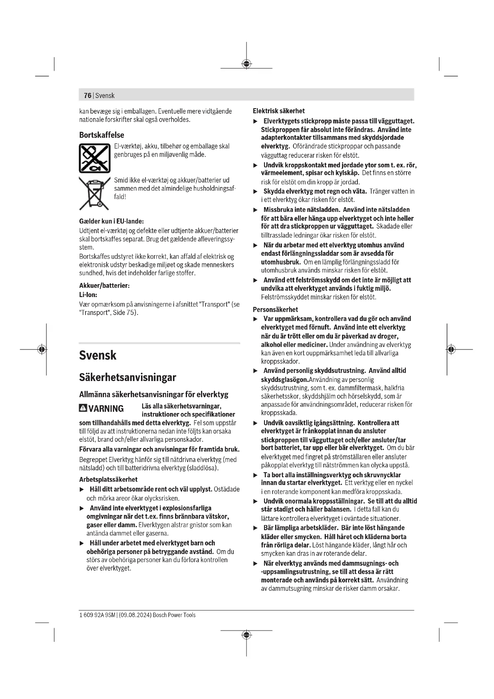 Ændringer i omdrejningstal og/eller drejningsmoment kan påvirke præcisionen. Maskinesn kapacitet skal testes med den aktuelle indstilling. Akku Bosch sælger også akku-værktøjer uden akku. Om der følger en akku med din leverance fremgår af emballagen. 1 609 92A 9SM | (09.08.2024) Bosch Power ToolsDansk | 73 Opladning af akku u Brug kun de ladeaggregater, der fremgår af de tekni- ske data. Kun disse ladeaggregater er afstemt i forhold til den Li-ion-akku, der bruges på dit el-værktøj. Bemærk! Lithium-ion-akkuer udleveres delvis opladet på grund af internationale transportforskrifter. For at sikre at akkuen fungerer 100%, skal du oplade akkuen helt i op- laderen før første ibrugtagning. Isætning af akku Skub den opladede akkuind i akkuholderen, så den går hør- bart i indgreb. Udtagning af akku Akkuen tages ud ved at trykke på akku-oplåsningsknap- penog trække akkuen ud af el-værktøjet. Undgå brug af vold. Akku-ladetilstandsindikator (gul lysdiode) Akku-ladetil- standsindi- kator Betydning Blinklys + akustisk sig- nal Opladning af akku: Der kan stadig udføres 6-8 forskruninger. Konstant lys + akustisk signal Der er ikke kapacitet til en ny forskruning, el- ler el-værktøjet er overbelastet: El-værktøjet kan ikke mere tændes. – Tag akkuen ud, og isæt en fuldt opladet akku. Blinklys El-værktøjet er overophedet og ude af drift: – Vent, til blinklyset automatisk stopper ef- ter kort tid, før du igen tager el-værktøjet i brug. Når du isætter akkuen(7) og trykker på tænd/sluk- knappen(8), viser akku-ladetilstandsindikatoren akkuens ladetiltand i 5sekunder. Akku-ladetilstandsindikator Kapacitet Grøn 60–100% Gul 30–60% Rød 0–30% Henvisninger til optimal håndtering af akkuen Beskyt akkuen mod fugtighed og vand. Opbevar kun akkuen i et temperaturområde fra −20°C til 50°C. Opbevar ikke akkuen i bilen f.eks. om sommeren. Når driftstiden pr. opladning forkortes væsentligt, er det tegn på, at akkuerne er slidt op og skal udskiftes. Læs og overhold henvisningerne mht. bortskaffelse. Montering u Tag akkuen ud af el-værktøjet, før du udfører arbejde på det (f.eks.vedligeholdelse, værktøjsskift, etc.). Utilsigtet aktivering af tænd/sluk-knappen er forbundet med kvæstelsesfare. Drifts- og opbevaringsforhold El-værktøjet må udelukkende bruges på et lukket anven- delsessted. For at sikre en fejlfri drift skal el-værktøjets tilladte omgi- velsestemperatur ligge mellem 0og +45 °C, ved en tilladt re- lativ luftfugtighed mellem 20 og 95% fri for tildugning. Ophængningsanordning (se billedeA) Med ophængningsbøjlen(12) kan du fastgøre el-værktøjet på en ophængningsanordning. – Sæt ophængningsbøjlen(12) på el-værktøjet, og lad den gå i indgreb i hullerne(13). u Kontrollér regelmæssigt, at ophængningsbøjlen og krogene i ophængningsanordningen er i en forsvarlig tilstand. Montering af 180 W-vinkelhoved (se billedeB) Ved disse industrielle akku-vinkelskruemaskiner skal der først monteres en adapter og et passende vinkelskruehoved (se "Tekniske data", Side71). – Sæt 180 W-vinkelhovedet på adapteren, og spænd med en gaffelnøgle(16) på nøglefladen til omløbermøtrikken(14). Brug i den forbindelse gaffelnøglen(17) an mod nøglefladen til adapteren(15). u Gevind og flangegevind skal være fri for fedt, og det kor- rekte drejningsmoment (se "Tekniske data", Side71) skal anendes, så vinkelhovedet ikke kan løsnes. – Drej kontramøtrikken(18) helt bagud i pilens retning a (venstregevind). – Drej adapteren helt bagud i pilens retning a (venstrege- vind). u Fastspænd aldrig el-værktøjet på husskålene. – Drej adapteren tilbage mod højre, indtil vinkehovedet be- finder sig i den ønskede position, maks. 360°. – Fastgør adapteren i denne position ved at dreje kontramøtrikken(18) i pilens retning c mod adapteren med et egnet værktøj (tapnøgle iht. DIN 1810 form B str. 25/28). Spænd kontramøtrikken(18) med det korrekte tilspændingsmoment (se "Tekniske data", Side71). Hold imod med et egnet værktøj. u Gevind og flangegevind skal være fri for fedt, og det kor- rekte drejningsmoment (se "Tekniske data", Side71) skal anendes, så vinkelhovedet ikke kan løsnes. – Hold el-værktøjet fast med gaffelnøglen(17) på adapte- rens nøgleflade(15). Montering af 12 V-vinkelhovedet (se billedeC) Ved disse industrielle akku-vinkelskruemaskiner skal der først monteres et passende vinkelskruehoved (se "Tekniske data", Side71). Vinkelskruehovedet(3) med værktøjsholder (2) kan indstil- les trinløst med 360°. Bosch Power Tools 1 609 92A 9SM | (09.08.2024)74 | Dansk – Drej kontramøtrikken(18) helt bagud i pilens retning a (venstregevind). u Fastspænd aldrig el-værktøjet på husskålene. – Drej vinkelskruehovedet(3) i pilens retning d til anslag på flangen. Drej i den forbindelse tilbage i retningen b, indtil den ønskede arbejdsvinkel er nået, dog maks. 360° én gang. – Fastgør vinkelskruehovedet(3) i denne position ved at dreje kontramøtrikken(18) i pilens retning c mod vinkel- skruehovedet med et egnet værktøj (tapnøgle iht. DIN 1810 form B str. 25/28). Spænd kontramøtrikken(18) med det korrekte tilspændingsmoment (se "Tekniske da- ta", Side71). I den forbindelse skal du anbringe et egnet værktøj (tapnøgle iht. DIN 1810 form B str. 20/22) i en åbning i vinkelhovedet og holde imod. u Gevind og flangegevind skal være fri for fedt, og det kor- rekte drejningsmoment (se "Tekniske data", Side71) skal anendes, så vinkelhovedet ikke kan løsnes. Indstilling af 12 V-vinkelhovedet Vinkelskruehovedet(3) med værktøjsholder(2) kan indstil- les trinløst med 360°. – Løsn kontramøtrikken(18) ved at anbringe et egnet værktøj (tapnøgle iht. DIN 1810 form B str. 25/28) i en åbning i kontramøtrikken, og drej i pilens retning a (ven- stregevind). I den forbindelse skal du anbringe et egnet værktøj (tapnøgle iht. DIN 1810 form B str. 20/22) i en åbning i vinkelhovedet og holde imod. u F