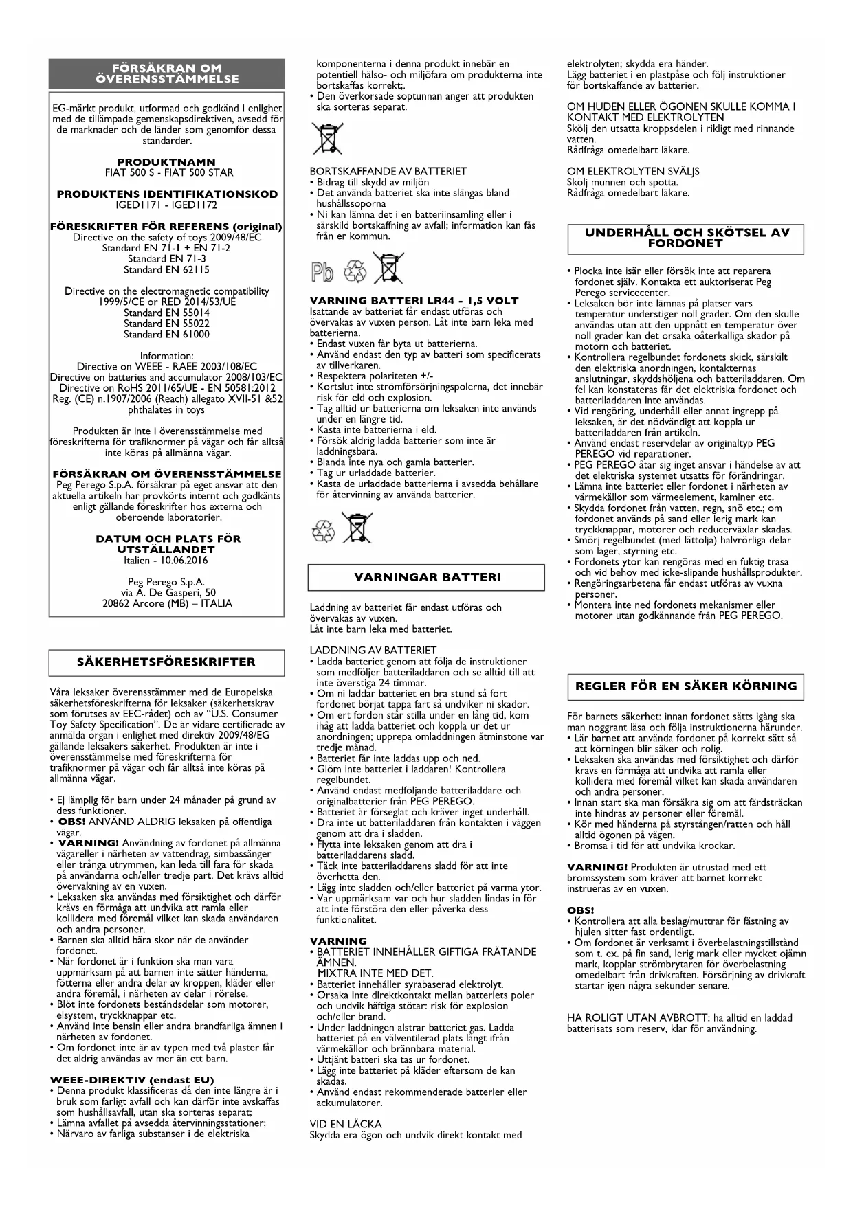 Peg Perego S.p.A. försäkrar på eget ansvar att den aktuella artikeln har provkörts internt och godkänts enligt gällande föreskrifter hos externa och oberoende laboratorier.