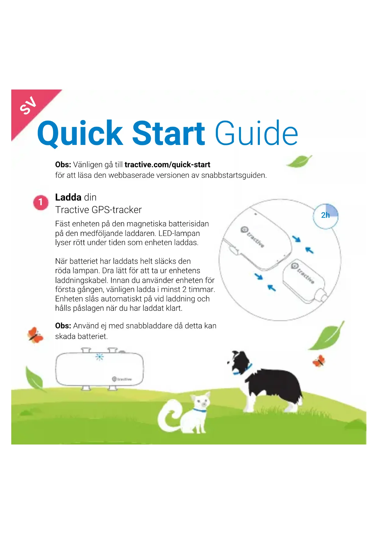 Obs: Vänligen gå till tractive.com/quick-start för att läsa den webbaserade versionen av snabbstartsguiden. Ladda din Tractive GPS-tracker Fäst enheten på den magnetiska batterisidan på den medföljande laddaren. LED-lampan lyser rött under tiden som enheten laddas. När batteriet har laddats helt släcks den röda lampan. Dra lätt för att ta ur enhetens laddningskabel. Innan du använder enheten för första gången, vänligen ladda i minst 2 timmar. Enheten slås automatiskt på vid laddning och hålls påslagen när du har laddat klart. Obs: Använd ej med snabbladdare då detta kan skada batteriet.2