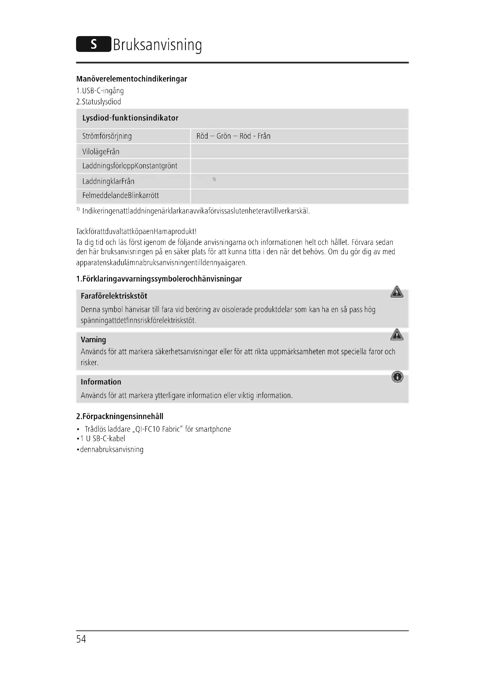 Indikeringen att laddningen är klar kan avvika för vissa slutenheter av tillverkarskäl. Tack för att du valt att köpa en Hamaprodukt! Ta dig tid och läs först igenom de följande anvisningarna och informationen helt och hållet. Förvarasedan den här bruksanvisningen på en säker plats för att kunna titta iden när det behövs. Om du gör dig av med apparaten ska du lämna bruksanvisningen till den nya ägaren.