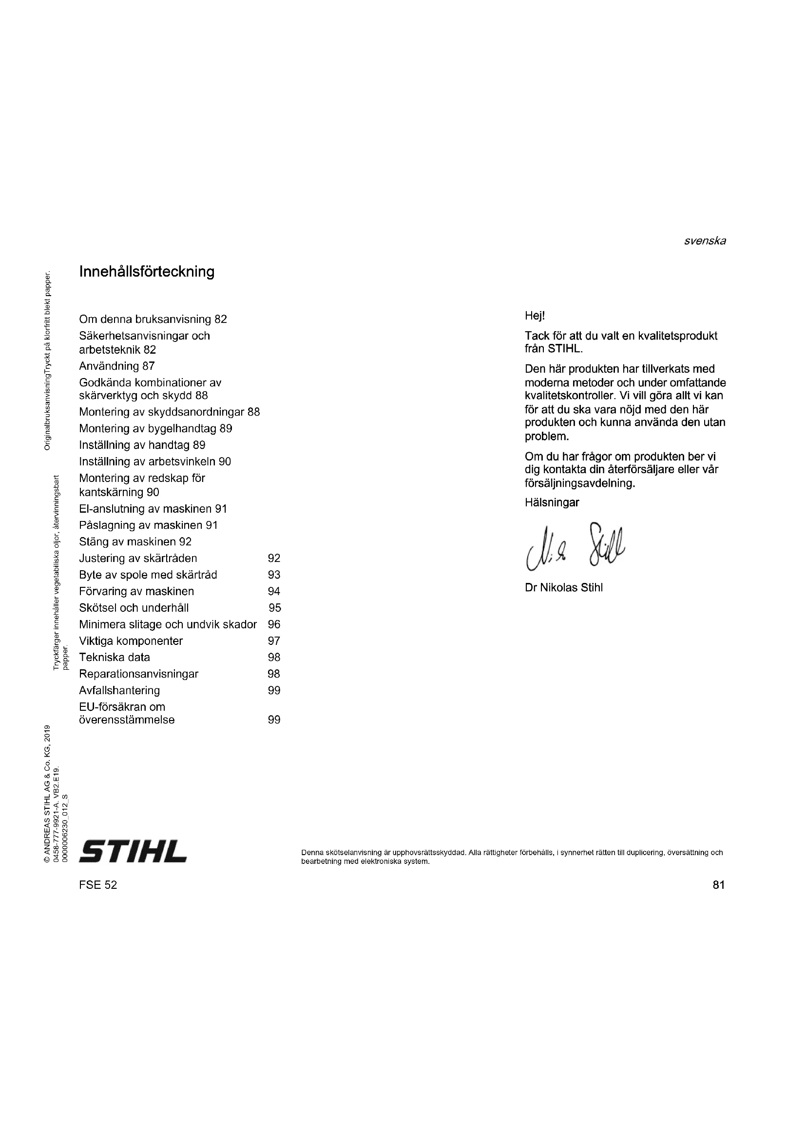 Denna skötselanvisning är upphovsrättsskyddad. Alla rättigheter förbehålls, i synnerhet rätten till duplicering, översättning och bearbetning med elektroniska system. Innehållsförteckning Hej! Tack för att du valt en kvalitetsprodukt från STIHL. Den här produkten har tillverkats med moderna metoder och under omfattande kvalitetskontroller. Vi vill göra allt vi kan för att du ska vara nöjd med den här produkten och kunna använda den utan problem. Om du har frågor om produkten ber vi dig kontakta din återförsäljare eller vår försäljningsavdelning. Hälsningar Dr Nikolas Stihl Om denna bruksanvisning 82 Säkerhetsanvisningar och arbetsteknik 82 Användning 87 Godkända kombinationer av skärverktyg och skydd 88 Montering av skyddsanordningar 88 Montering av bygelhandtag 89 Inställning av handtag 89 Inställning av arbetsvinkeln 90 Montering av redskap för kantskärning 90 El-anslutning av maskinen 91 Påslagning av maskinen 91 Stäng av maskinen 92 Justering av skärtråden 92 Byte av spole med skärtråd 93 Förvaring av maskinen 94 Skötsel och underhåll 95 Minimera slitage och undvik skador 96 Viktiga komponenter 97 Tekniska data 98 Reparationsanvisningar 98 Avfallshantering 99 EU-försäkran om överensstämmelse 99FSE 52 svenska