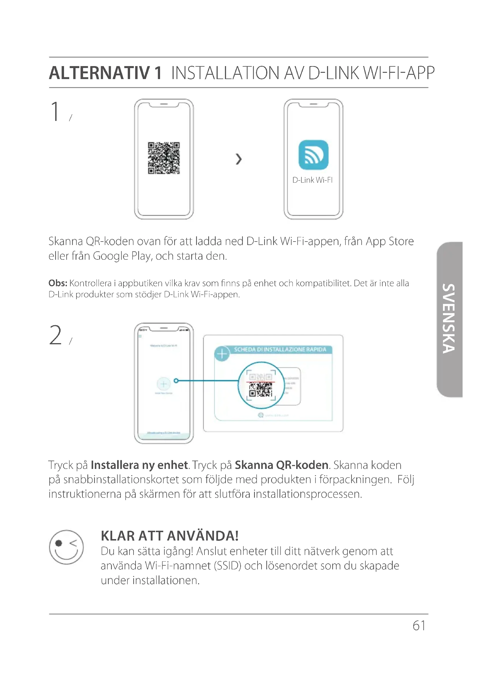 KLAR ATT ANVÄNDA! Du kan sätta igång! Anslut enheter till ditt nätverk genom att använda Wi-Fi-namnet (SSID) och lösenordet som du skapade under installationen.