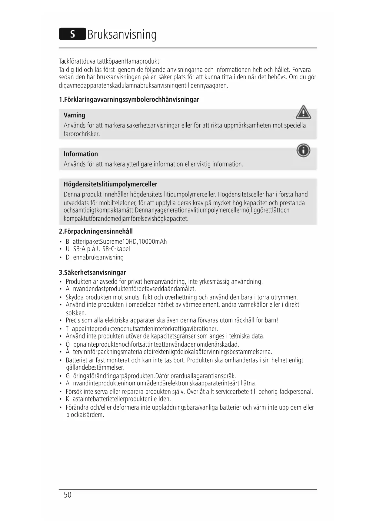 - Förändraoch/eller deformerainte uppladdningsbara/vanliga batterier och värm inte upp dem eller plocka isär dem. S Bruksanvisning51