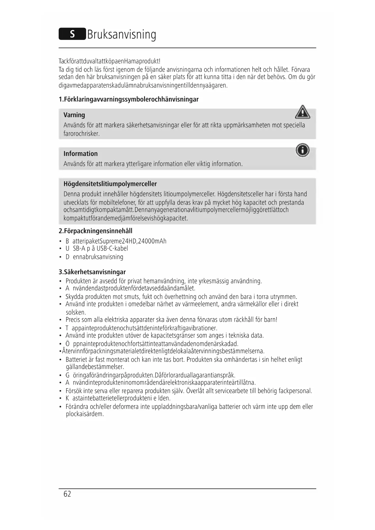 - Förändraoch/eller deformerainte uppladdningsbara/vanliga batterier och värm inte upp dem eller plocka isär dem. S Bruksanvisning63