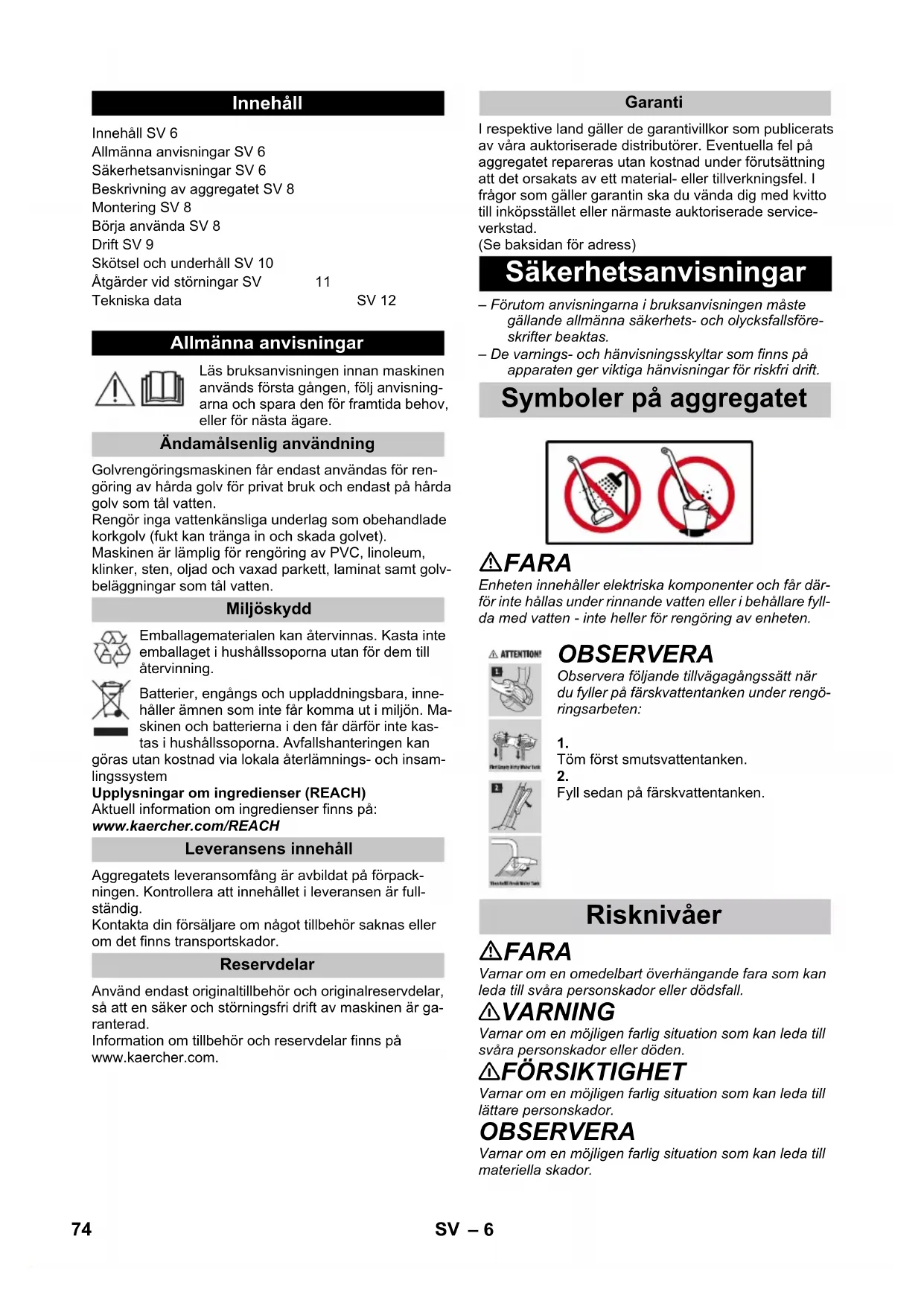 - EWM 2 ** EWM 2 Premium OBSERVERA Det är viktigt att nätsladden ligger helt i styrskenan inn- an handtagslisten monteras. Bild Stick in handtaget i grundmaskinen så att det hörs att det hakar fast. Handtaget måste sitta fast ordentligt i maskinen. Bild Ställ maskinen i parkeringsstationen så att den står stadigt. Bild Vrid in rengöringsvalsarna så långt det går på hål- laren. Sätt in valsarna åt rätt håll med hjälp av färgmarke- ringarna (t.ex. blått mot blått). Kontrollera att rengöringsvalsarna sitter fast or- dentligt när de satts in. Bild Anslut laddkabeln till maskinens laddningsuttag. Sätt laddarens nätkontakt i ett vägguttag. Bild LED-kontrollamporna visar batteriets aktuella ladd- ningstillstånd. När det hela tomma batteriet laddas blinkar alla 3 LED-kontrollampor efter varandra, nedifrån och upp. Vid 1/3 batteriladdning lyser den nedersta LED:en konstant, men de övre LED:erna fortsätter att blinka. Vid 2/3 batteriladdning lyser de båda nedre LED:er- na konstant, men den översta LED:en fortsätter att blinka. Efter att batteriet har laddats helt lyser de 3 LED- kontrollamporna konstant i ytterligare 60 minuter. Efter den här tiden slocknar LED-kontrollamporna. Bild Dra ut nätkontakten ur eluttaget och laddkabeln ur laddningsuttaget efter laddningen. Bild Ställ maskinen i parkeringsstationen. Bild Håll färskvattentanken i handtagsfördjupningen och ta ut den ur maskinen. Bild Öppna tanklocket och vrid det åt sidan. Bild Fyll färskvattentanken med kallt eller ljummet kran- vatten. Rengörings- eller skötselmedel från KÄRCHER kan fyllas på efter behov i färskvattentanken.* Överskrid inte markeringen ”MAX” när du fyller på. Stäng tanklocket. Bild Sätt tillbaka tanken i maskinen. Färskvattentanken måste sitta fast ordentligt i ma- skinen. OBSERVERA *Dosera rengörings- eller skötselmedlet korrekt enligt anvisningarna. Beskrivning av aggregatet 1 TILL-/FRÅN brytare 2 Handtag 3 Vägghalksäkring handtag 4 Färskvattentank 5 Greppfördjupning på färskvattentanken 6 Laddningsuttag 7 Smutsvattentank 8 Handtag på rengöringsvals 9 Rengöringsvalsar 10 Golvhuvudkåpa 11 Förregling golvhuvudkåpa 12 Batteriindikering 13 Laddare med laddkabel 14 Parkeringsstation 15 Förvaring valsar 16 * Rengöringsmedel RM 536 30 ml 17 ** Rengöringsmedel RM 534 30 ml 18 ** Rengöringsmedel RM 536 500 ml 9 ** Rengöringsvalsar 2x Montering Börja använda Montera valsar Laddningsförlopp Fyll färskvattentanken 76 SV– 9 OBSERVERA Bild Maskinen kan bara suga upp smuts och vätska (max. 140 ml). Bild Sopa eller dammsug golvet innan du påbörjar arbetet. Detta gör att golvet är fritt från smuts/lösa partiklar före den fuktiga rengöringen. Kontrollera om golvet tål vatten på ett ställe som inte syns väl innan maskinen används. Rengör inte vatten- känsliga ytor som obehandlade korkgolv (fukt kan tränga in och skada golvet). Information För att undvika strimmor, testa först maskinen på känsliga ytor, t.ex. trä eller stengods, på ett ställe som inte syns så väl. Stanna inte på ett ställe, utan fortsätt framåt. Följ instruktionerna från golvbeläggningens tillver- kare. Bild Arbeta bakåt mot dörren så att du inte lämnar fotavtryck på det nytvättade golvet. Golvet rengörs genom att man för maskinen fram och tillbaka med samma hastighet som när man dammsuger. Låt maskinen långsamt glida över golvet om det är mycket smutsigt. Du behöver inte använda tryck på maskinen. Vid leveransomfång av borstvalsar i par i grått och gult: Båda paren borstvalsar har samma funktiona- litet men kan användas för olika användningsområ- den (åtskillnad vad färgerna beträffar, t.ex. för kök och badrum). OBSERVERA Direkt när maskinen startas börjar rengöringsvalsarna att rotera. Håll hårt i handtaget så att maskinen inte åker iväg. Kontrollera att det finns vatten i färskvattentanken och att smutsvattentanken är insatt i maskinen. Bild Tryck på strömbrytaren (På-/Av) för att starta ma- skinen. Dra med maskinen fram och tillbaka flera gånger tills valsarna är tillräckligt fuktade. Bild – 3 LED lyser – 3/3 batteriets hållbarhet (full körtid). – 2 LED lyser – 2/3 batteriets hållbarhet. – 1 LED lyser – 1/3 batteriets hållbarhet. Ca 2 minuter innan batteriet är tomt blinkar den ne- dersta LED:en. När batteriet är tomt och maskinen har stängts av blinkar den nedersta LED:en snabbare i 60 sekun- der. OBSERVERA Töm smutsvattentanken innan färskvattentanken fylls på. Det förhindrar att smutsvattentanken svämmar över. Se kapitlet ”Fyll färskvattentanken”. Se kapitlet ”Töm smutsvattentanken”. Bild Ställ maskinen i parkeringsstationen. Bild Manövrera golvhuvudkåpans förregling. Ta av golvhuvudkåpan. Bild Ta ut smutsvattentanken ur golvhuvudet. Bild Fäll upp luckorna över de båda smutsvattentankar- na. Töm smutsvattentanken. Bild Rengör golvhuvudkåpan och smutsvattentanken med kranvatten om det behövs. Luckorna på de båda smutsvattentankarna kan tas av och rengöras separat. Sätt tillbaka och lås luckorna på de båda smutsvat- tentankarna. Bild Sätt in smutsvattentanken i golvhuvudet. Bild Manövrera golvhuvudkåpans förregling och sätt skyddet på golvhuvudet. Släpp sedan förreglingen. Smutsvattentanken och golvhuvudkåpan måste sitta fast i eller på maskinen. OBSERVERA Vid längre arbetsuppehåll rekommenderar vi att ställa maskinen i parkeringsstationen, för att undvika skador på känsliga golv till följd av de fuktiga valsarna. Bild Stäng av maskinen genom att trycka på strömbry- taren. Bild Ställ maskinen i parkeringsstationen. Bild Stäng av maskinen genom att trycka på strömbry- taren. Bild Ställ maskinen i parkeringsstationen. OBSERVERA Rengör maskinen när du är klar. Bild Töm ut vattnet om det fortfarande finns något kvar i färskvattentanken. Bild till Rengör smutsvattentanken, golvhuvudkåpan och rengöringsvalsarna. Se kapitle