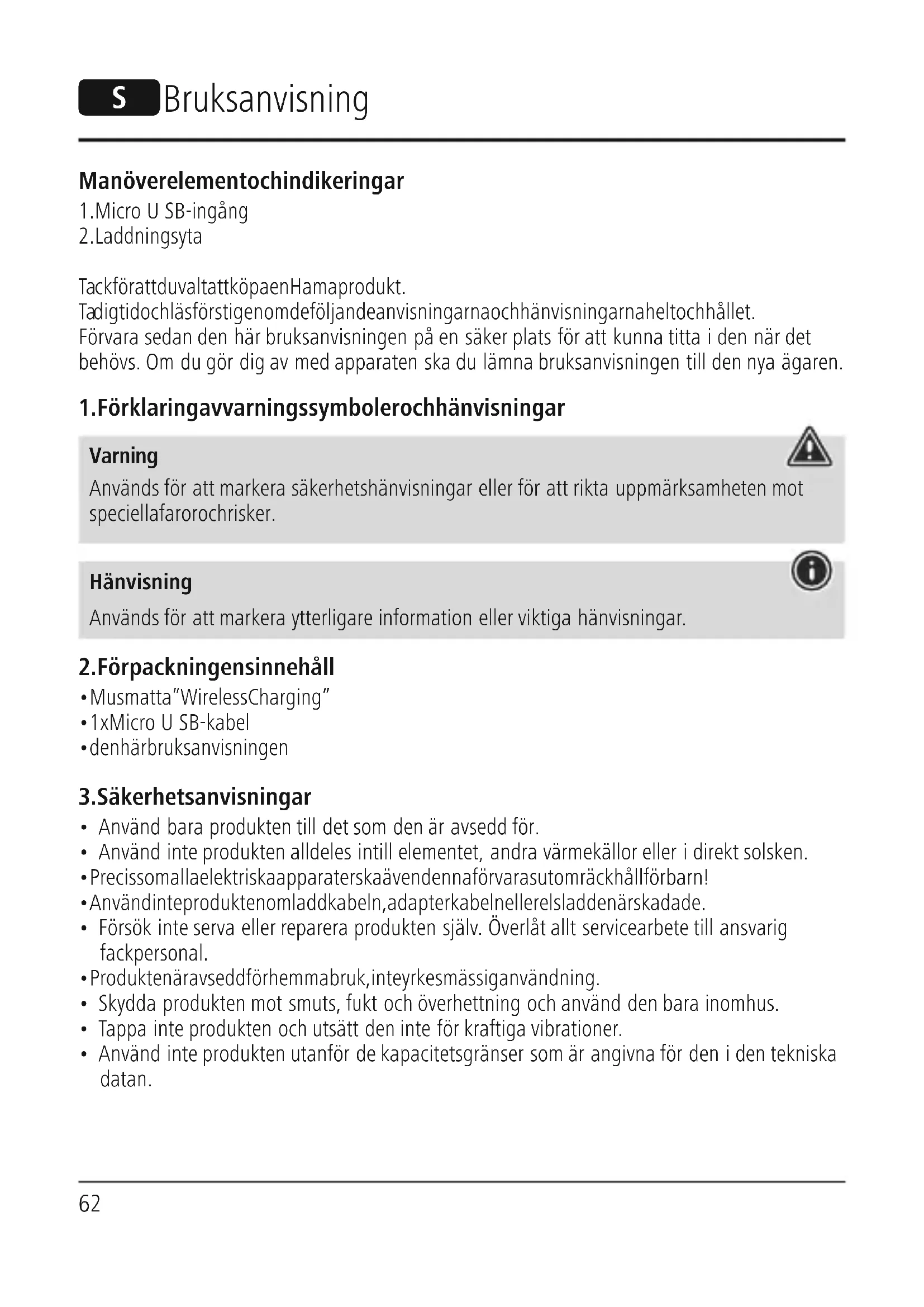 - Tänk på att mobiltelefonfodral, skydd osv.samt övrigt material mellan musmattan ”Wireless Charging” och smartphonens baksida kan störaeller tilloch med blockera laddningen. Varning!