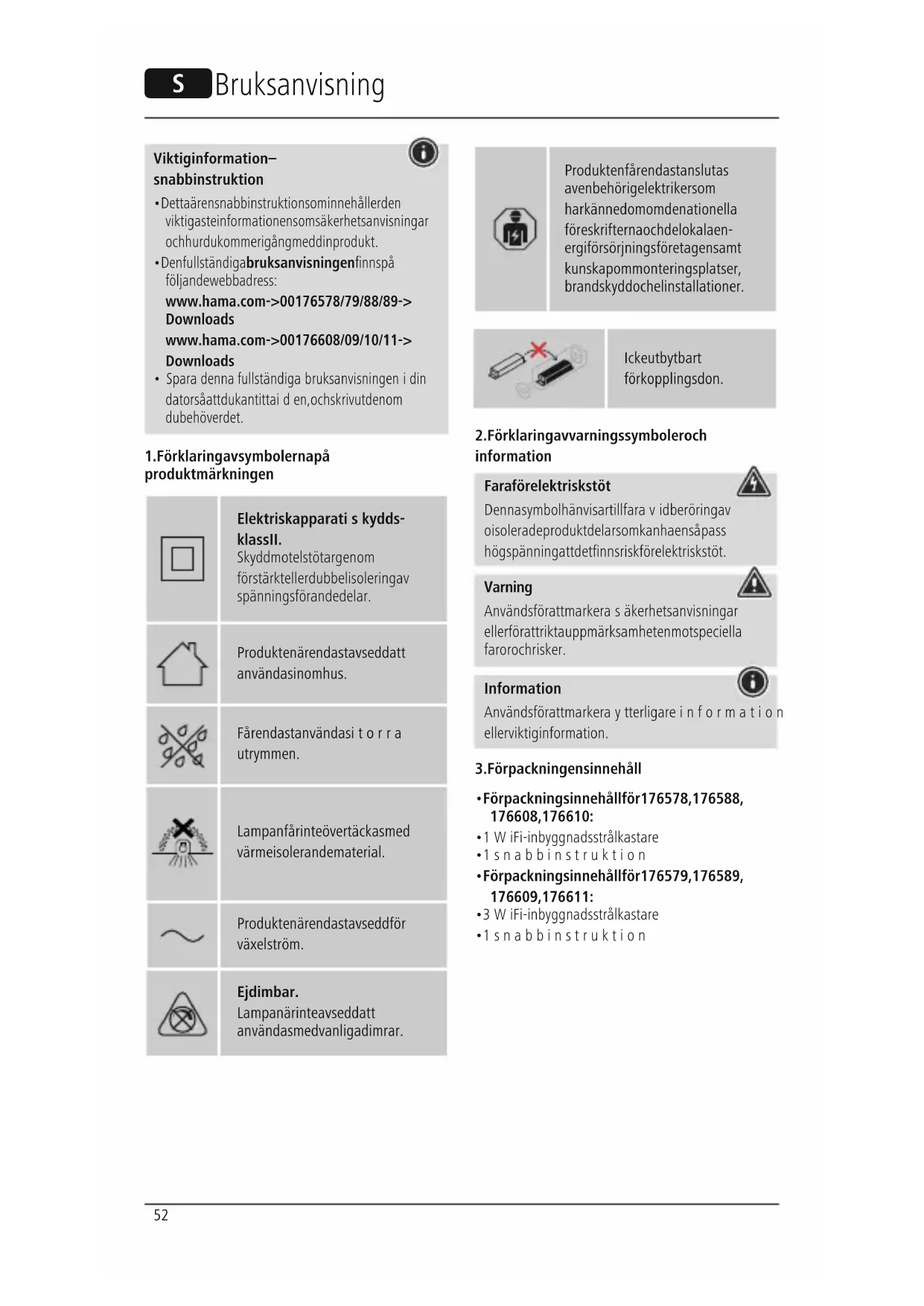 - Förpackningsinnehåll för 176579, 176589, 176609, 176611: