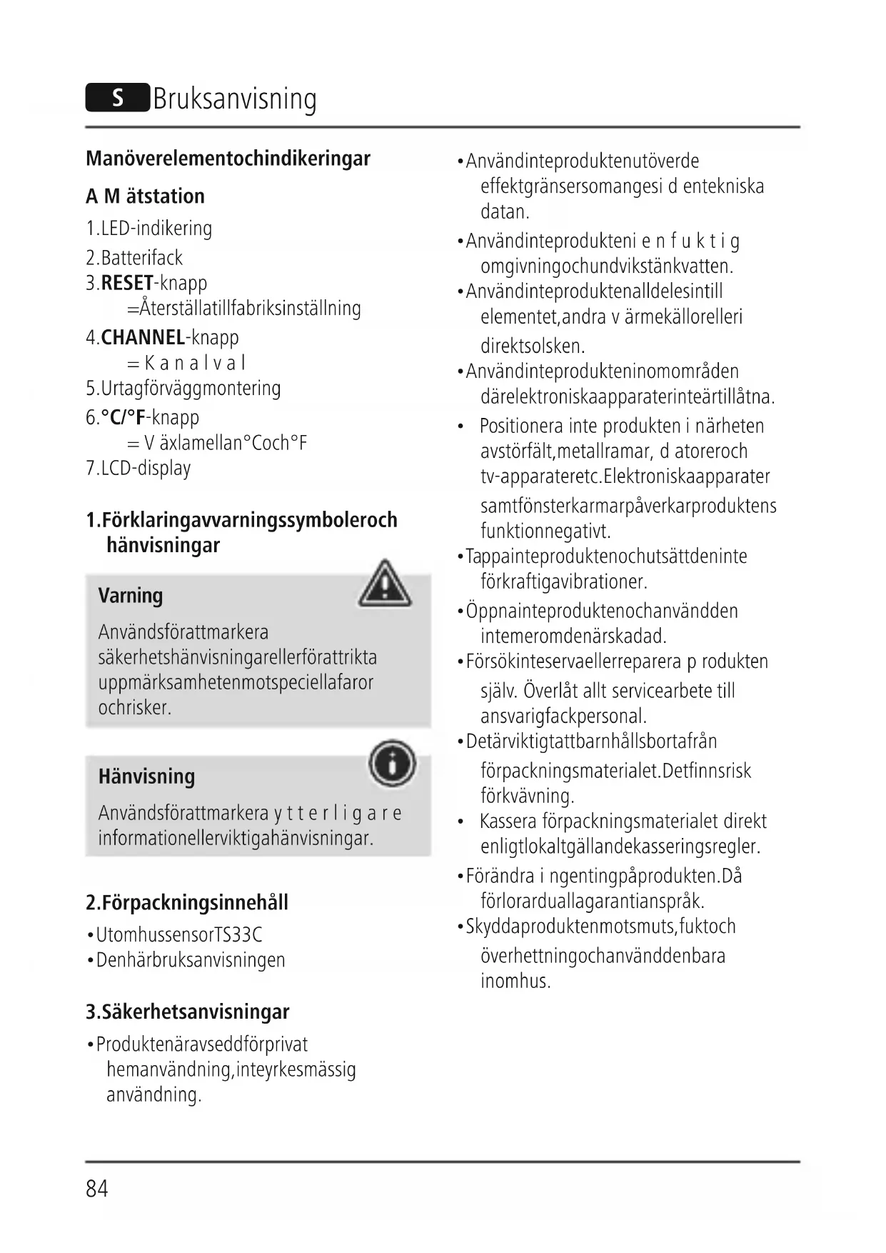 - Skydda produkten mot smuts, fukt och överhettning och använd den bara inomhus. S Bruksanvisning85 Varning –Batterier