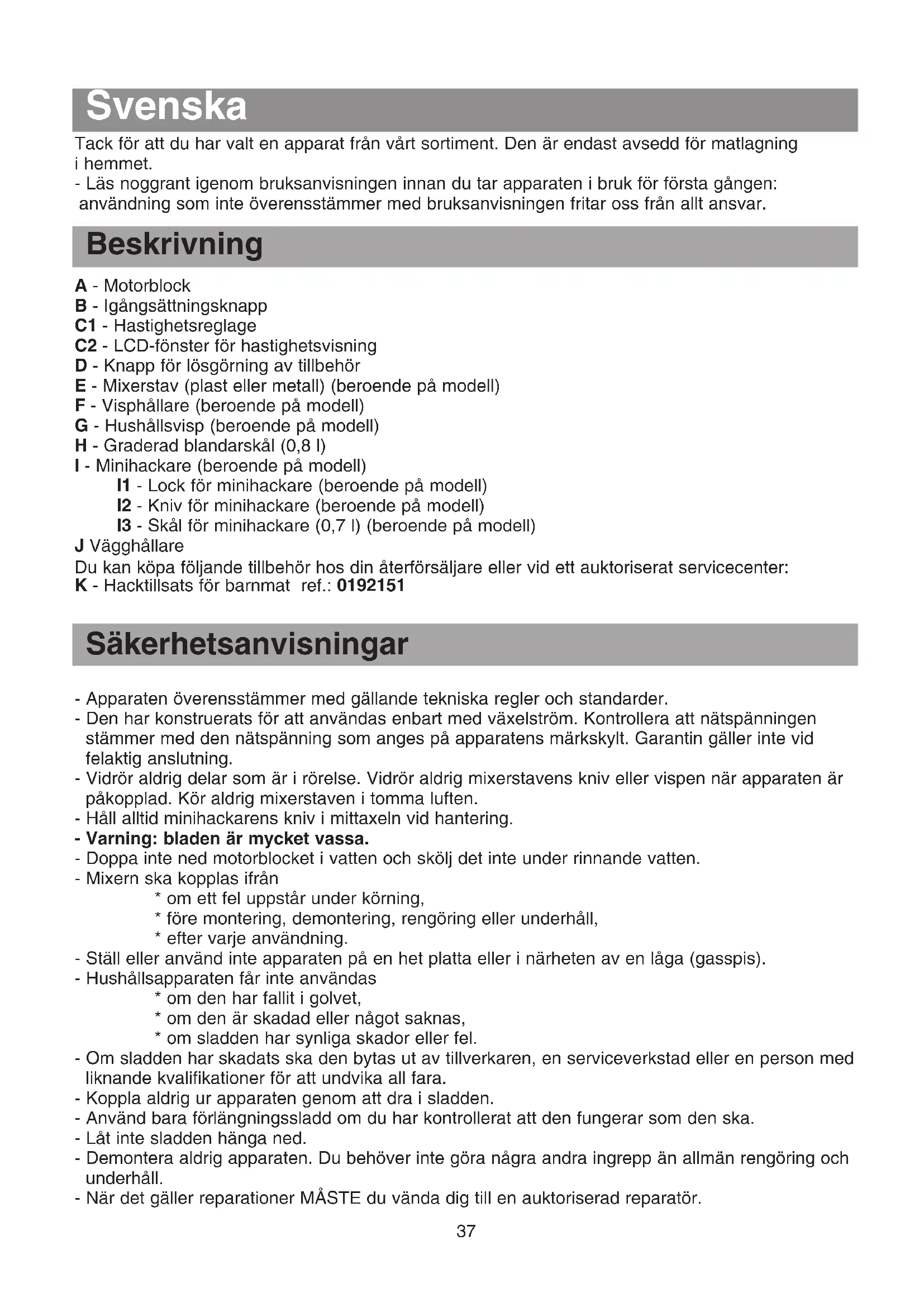 Ha i det gradinndelte blandebegeret (H) 1 eggeplomme, 1 spiseskje sennep, 1 spiseskje vineddik, salt og pepper, begynn å mikse og hell så i 2 1/4 dl olje i litt etter litt samtidig som du utfører bevegelser nedenfra og opp. Dampkok i en trykkoker 500 g potet, 400 g gulrot, 1 purreløk, salt og pepper, 1,8 liter vann. Miks alt til slutt. 200 g mel, en knivsodd salt, 1/2 liter melk, 40 g smeltet smør, 3 egg. 2 poser melis, 200 g crème fraîche. Mandler (125 g) 15 s Kavringer (40 g) 10 s Persille (30 g) 5 s Kokt skinke (150 g) 8 s Løk kuttet i fire båter (200 g) 6 s Med dette tilbehøret kan du hakke 45 g svinekjøtt (bryststykke) på 3 sekunder. Rengjøring - FORSIKTIG: Knivene er veldig skarpe. - Du må alltid ta støpselet ut av veggkontakten før du rengjør apparatet. - Ikke legg apparatet, strømledningen eller støpselet ned i vann eller annen væske. - Motorenheten (A), festeenheten for vispen (F) og lokket til minihakkeapparatet (I1) skal ikke vaskes i oppvaskmaskin. - De skal aldri legges ned i vann eller under rennende vann. Rengjør de med en fuktig svamp. - Miksestaven (E) (med kniven oppover), vispen (G) (med vispen oppover), det gradinndelte blandebegeret (H), kniven (I2) og begeret til minihakkeapparatet (I1) kan vaskes i oppvaskmaskin. - Vi anbefaler deg å rengjøre miksestaven raskt etter at du har brukt den. Hvis plastdelene er blitt farget av matsorter som f.eks. gulrot, kan du gni de med litt bomull fuktet med matolje, og så foreta vanlig rengjøring etterpå. hanovre 2544615 6/04/06 14:33 Page 3536 Rydde på plass Bruk veggstativet (J) slik at du alltid har mikseren for hånden. For å feste veggstativet borer du to festepunkter horisontalt med 80 mm mellomrom og så setter du støtten på festeskruene i riktig retning. hanovre 2544615 6/04/06 14:33 Page 3637 Beskrivning A - Motorblock B - Igångsättningsknapp C1 - Hastighetsreglage C2 - LCD-fönster för hastighetsvisning D - Knapp för lösgörning av tillbehör E - Mixerstav (plast eller metall) (beroende på modell) F - Visphållare (beroende på modell) G - Hushållsvisp (beroende på modell) H - Graderad blandarskål (0,8 l) I - Minihackare (beroende på modell) I1 - Lock för minihackare (beroende på modell) I2 - Kniv för minihackare (beroende på modell) I3 - Skål för minihackare (0,7 l) (beroende på modell) J Vägghållare Du kan köpa följande tillbehör hos din återförsäljare eller vid ett auktoriserat servicecenter: K - Hacktillsats för barnmat ref.: 0192151 Säkerhetsanvisningar - Apparaten överensstämmer med gällande tekniska regler och standarder. - Den har konstruerats för att användas enbart med växelström. Kontrollera att nätspänningen stämmer med den nätspänning som anges på apparatens märkskylt. Garantin gäller inte vid felaktig anslutning. - Vidrör aldrig delar som är i rörelse. Vidrör aldrig mixerstavens kniv eller vispen när apparaten är påkopplad. Kör aldrig mixerstaven i tomma luften. - Håll alltid minihackarens kniv i mittaxeln vid hantering. - Varning: bladen är mycket vassa. - Doppa inte ned motorblocket i vatten och skölj det inte under rinnande vatten. - Mixern ska kopplas ifrån
