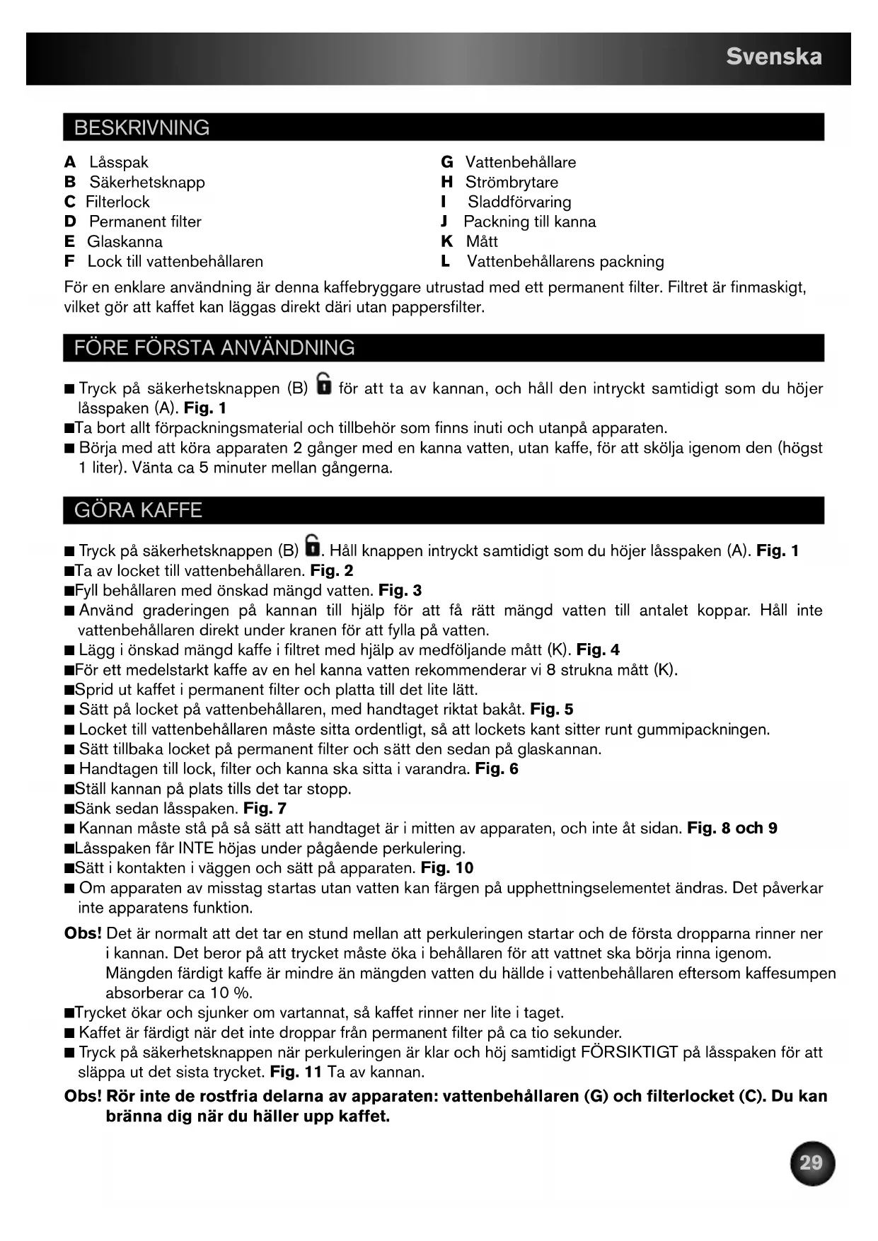 ■ Tryck på säkerhetsknappen (B) . Håll knappen intryckt samtidigt som du höjer låsspaken (A). Fig. 1 ■ Ta av locket till vattenbehållaren. Fig. 2 ■ Fyll behållaren med önskad mängd vatten. Fig. 3 ■ Använd graderingen på kannan till hjälp för att få rätt mängd vatten till antalet koppar. Håll inte vattenbehållaren direkt under kranen för att fylla på vatten. ■ Lägg i önskad mängd kaffe i filtret med hjälp av medföljande mått (K). Fig. 4 ■ För ett medelstarkt kaffe av en hel kanna vatten rekommenderar vi 8 strukna mått (K). ■ Sprid ut kaffet i permanent filter och platta till det lite lätt. ■ Sätt på locket på vattenbehållaren, med handtaget riktat bakåt. Fig. 5 ■ Locket till vattenbehållaren måste sitta ordentligt, så att lockets kant sitter runt gummipackningen. ■ Sätt tillbaka locket på permanent filter och sätt den sedan på glaskannan. ■ Handtagen till lock, filter och kanna ska sitta i varandra. Fig. 6 ■ Ställ kannan på plats tills det tar stopp. ■ Sänk sedan låsspaken. Fig. 7 ■ Kannan måste stå på så sätt att handtaget är i mitten av apparaten, och inte åt sidan. Fig. 8 och 9 ■ Låsspaken får INTE höjas under pågående perkulering. ■ Sätt i kontakten i väggen och sätt på apparaten. Fig. 10 ■ Om apparaten av misstag startas utan vatten kan färgen på upphettningselementet ändras. Det påverkar inte apparatens funktion. Obs! Det är normalt att det tar en stund mellan att perkuleringen startar och de första dropparna rinner ner i kannan. Det beror på att trycket måste öka i behållaren för att vattnet ska börja rinna igenom. Mängden färdigt kaffe är mindre än mängden vatten du hällde i vattenbehållaren eftersom kaffesumpen absorberar ca 10 %. ■ Trycket ökar och sjunker om vartannat, så kaffet rinner ner lite i taget. ■ Kaffet är färdigt när det inte droppar från permanent filter på ca tio sekunder. ■ Tryck på säkerhetsknappen när perkuleringen är klar och höj samtidigt FÖRSIKTIGT på låsspaken för att släppa ut det sista trycket. Fig. 11 Ta av kannan. Obs! Rör inte de rostfria delarna av apparaten: vattenbehållaren (G) och filterlocket (C). Du kan bränna dig när du häller upp kaffet. A Låsspak B Säkerhetsknapp C Filterlock D Permanent filter E Glaskanna F Lock till vattenbehållaren G Vattenbehållare H Strömbrytare I Sladdförvaring J Packning till kanna K Mått L Vattenbehållarens packning Svenska