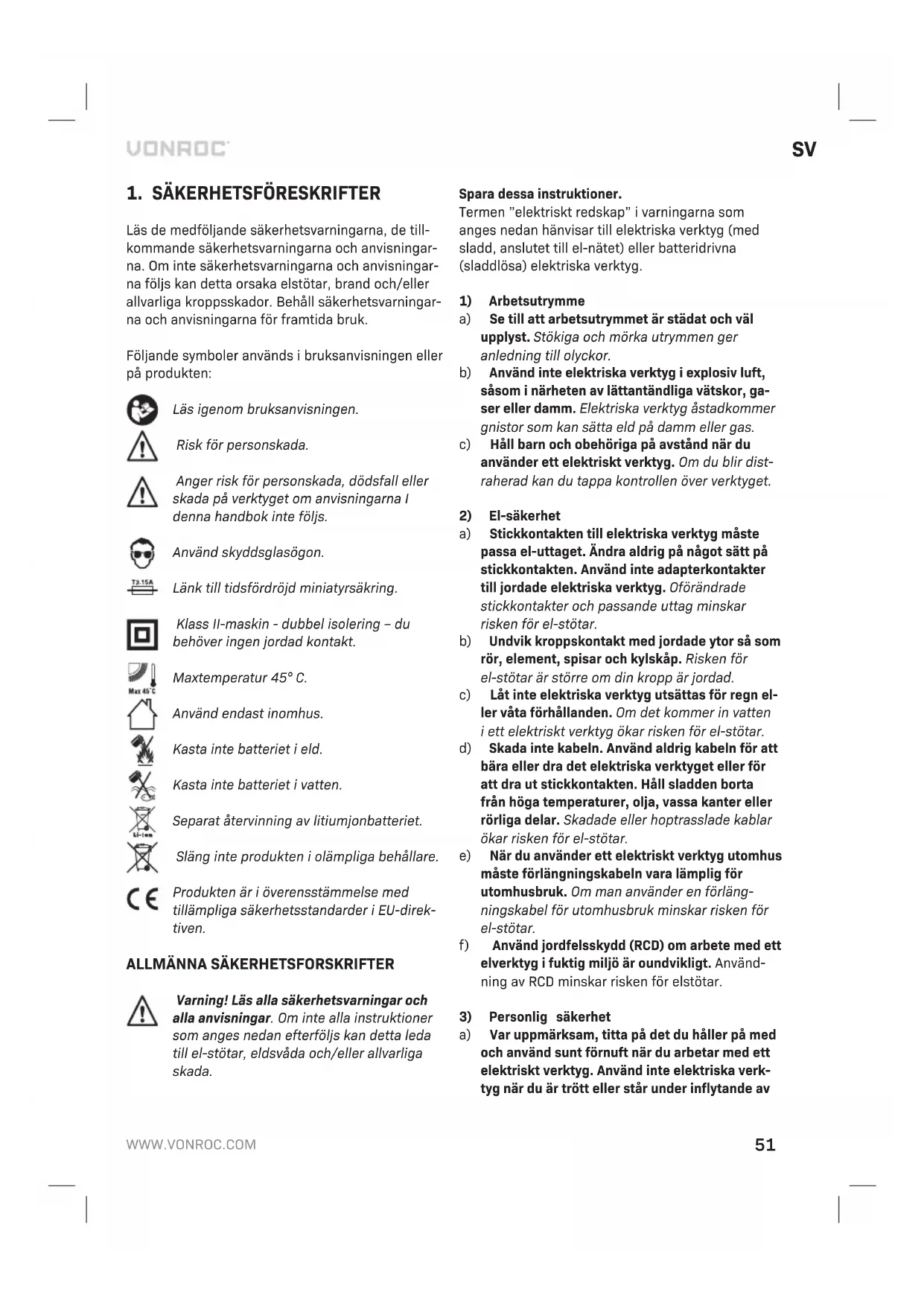 ordentligt mot arbetsstycket och försök igen. Om det inte sker någon förbättring av omarbetnin- gen kanske det valda materialet inte är lämpligt för verktyget eller så kan slagkraften behöva justeras. Rengöring Rengör maskinen hus regelbundet med en mjuk trasa, helst efter varje gång du använder maskinen. Se till att ventilationsöppningarna är fria från damm och smuts. Ta bort mycket ihållande smuts med en mjuk trasa fuktad med tvållösning. Använd inte lösningsmedel som bensin, alkohol, ammoniak osv. Sådana kemikalier skadar de syntetiska kompo- nenterna. MILJÖ Felaktig och/eller kasserad elektrisk eller elektronisk utrustning måste lämnas in på lämpliga återvinningsstationer. Endast för EU-länder Kassera inte elverktyg i hushållsavfall. Enligt den europeiska riktlinjen 2012/19/EU om kasserad elektrisk och elektronisk utrustning och dess tillämpning i nationell rätt måste elverktyg som inte längre är användbara samlas in separat och kasseras på ett miljövänligt sätt. GARANTI VONROC produkter är utvecklade enligt högsta kva- litetsstandard och garanteras vara utan defekter både vad gäller material och tillverkning under den period som stipuleras enligt lag med början från ursprungligt inköpsdatum. Om något fel uppstår på produkten under denna period på grund av material- och/eller tillverkningsfel skall VONROC kontaktas direkt. Följande omständigheter exkluderas från denna garanti: