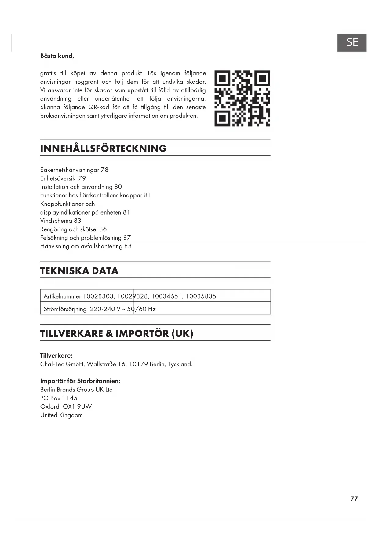 Säkerhetshänvisningar78 Enhetsöversikt79 Installation och användning80 Funktioner hos fjärrkontrollens knappar81 Knappfunktioner och displayindikationer på enheten81 Vindschema83 Rengöring och skötsel86 Felsökning och problemlösning87 Hänvisning om avfallshantering88 TEKNISKA DATA Artikelnummer 10028303, 10029328, 10034651, 10035835 Strömförsörjning 220-240 V ~ 50/60 Hz TILLVERKARE & IMPORTÖR (UK) Tillverkare: Chal-Tec GmbH, Wallstraße 16, 10179 Berlin, Tyskland. Importör för Storbritannien: Berlin Brands Group UK Ltd PO Box 1145 Oxford, OX1 9UW United Kingdom78