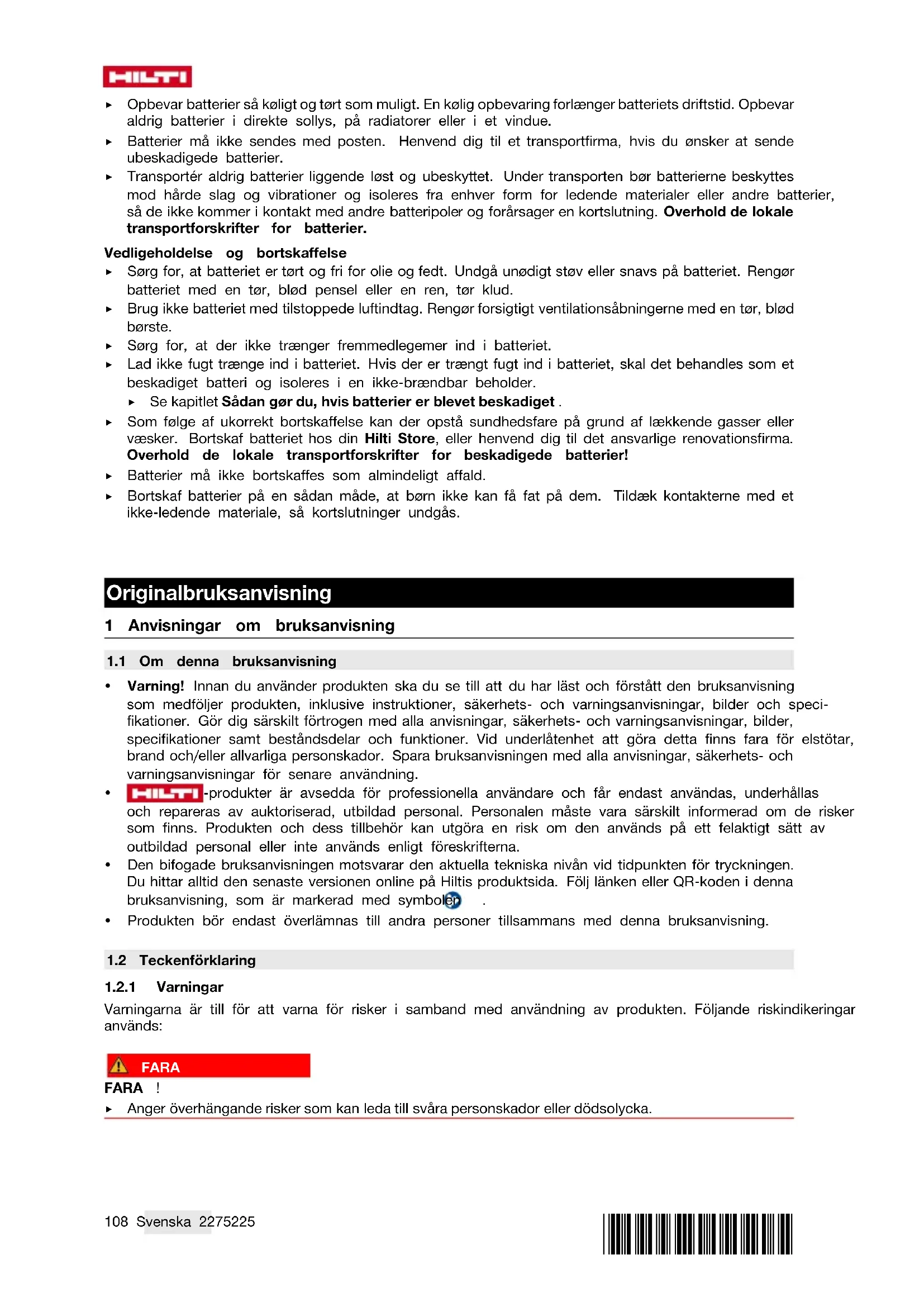 11 Tillverkargaranti ▶ Vänd dig till din lokala Hilti-representant om du har frågor om garantivillkoren.116 Svenska 2275225 *2275225* 12 Ytterligare information C 6-22 (01) RoHS (föreskrifter för begränsning av användningen av farliga ämnen) Tabellen gäller för den kinesiska marknaden.*2275225* 2275225 Svenska 117 Denna tabell gäller för den taiwanesiska marknaden. C 8-22 (01)118 Svenska 2275225 *2275225* RoHS (föreskrifter för begränsning av användningen av farliga ämnen) Tabellen gäller för den kinesiska marknaden.*2275225* 2275225 Svenska 119 Denna tabell gäller för den taiwanesiska marknaden. 13 Hilti-litiumjonbatterier Anvisningar för säkerhet och användning I denna dokumentation används begreppet batteri för Hiltis uppladdningsbara litiumjonbatterier där flera litiumjonceller har slagits samman. De är avsedda för Hiltis elverktyg och får endast användas till dessa. Använd endast originalbatterier från Hilti! Beskrivning Hilti-batterier är utrustade med cellhanterings- och cellskyddssystem. Batterierna består av celler som innehåller lagringsmaterial av litiumjoner, vilka möjliggör en hög specificerad energitäthet. Litiumjoncellerna utsätts för en väldigt liten minneseffekt, men reagerar kraftigt på ovarsam hantering, fullständig urladdning eller höga temperaturer. De produkter som är godkända för Hilti-batterier hittar du i din Hilti Store eller på: www.hilti.group Säkerhet ▶ Observera följande säkerhetsanvisningar för säker hantering och användning av litiumjonbatterier. Om åtgärderna inte följs kan det leda till hudirritation, svåra frätskador, kemiska brännskador, bränder och/eller explosioner. ▶ Hantera batterierna varsamt för att undvika skador och läckage av hälsovådliga syror! ▶ Batterier får absolut inte modifieras eller manipuleras! ▶ Batterier får inte tas isär, klämmas, hettas upp över 80 °C eller brännas. ▶ Använd inte och ladda inte batterier som har utsatts för slag eller på annat sätt är skadade. Kontrollera batterierna regelbundet för att se om de uppvisar tecken på skador. ▶ Använd aldrig återvunna eller reparerade batterier.120 Svenska 2275225 *2275225* ▶ Använd aldrig batteriet eller ett batteridrivet elverktyg som slagverktyg. ▶ Utsätt aldrig batterierna för direkt solljus, förhöjda temperaturer, gnistor eller öppna lågor. Detta kan leda till explosioner. ▶ Rör inte batteripolerna med dina fingrar, verktyg, smycken eller andra elektriskt ledande föremål av metall. Detta kan skada batteriet och orsaka såväl materiella skador som personskador. ▶ Håll batterierna borta från regn, väta och vätskor. Fukt som tränger sig in kan orsaka kortslutningar, elstötar, brännskador och explosioner. ▶ Använd endast batteriladdare och elverktyg som är avsedda för denna typ av batteri. Läs också igenom uppgifterna i motsvarande bruksanvisning. ▶ Använd inte och förvara inte batteriet i explosionsfarliga miljöer. ▶ Om batteriet är så hett att du inte kan ta i det kan det vara defekt. Ställ batteriet på en plats där inget riskerar att fatta eld och på betryggande avstånd från brännbart material. Låt batteriet svalna. Om batteriet efter en timme fortfarande är så hett att det inte går att ta i är det defekt. Följ anvisningarna i kapitel Åtgärder vid batteribrand. Hantering av skadade batterier ▶ Kontakta alltid din Hilti-servicepartner om ett batteri är skadat. ▶ Använd aldrig ett batteri som läcker syra. ▶ Undvik att läckande batterisyra kommer i direkt kontakt med ögonen eller huden. Bär alltid skydds- handskar och skyddsglasögon i samband med hantering av batterisyra. ▶ Använd ett för ändamålet godkänt kemiskt rengöringsmedel för att få bort batterisyra som läckt ut. Observera lokala rengöringsföreskrifter för batterisyra. ▶ Lägg det defekta batteriet i en icke brännbar behållare och täck det med torr sand, kritpulver (CaCO3) eller silikat (vermikulit). Sätt slutligen på locket så att det är lufttätt och förvara behållaren långt ifrån brännbara gaser, vätskor eller föremål. ▶ Kassera behållaren hos din Hilti Store eller vänd dig till närmaste återvinningscentral. Observera lokala transportföreskrifter för skadade batterier. Hantering av batterier som slutat fungera ▶ Se upp om batteriet beter sig onormalt, t.ex. om det inte laddar korrekt, har ovanligt lång laddningstid, uppvisar märkbart minskad arbetskapacitet, ovanliga LED-aktiviteter eller om det läcker batterisyra. Detta är tecken på invändiga problem. ▶ Kontakta Hilti-service om du misstänker att batteriet har ett invändigt problem. ▶ Om batteriet slutat fungera, inte längre vill ladda eller om det läcker batterisyra måste du kassera det. Se kapitel Underhåll och avfallshantering. Åtgärder vid batteribrand VARNING Faror vid batteribrand! Brinnande batterier utsöndrar farliga och explosiva vätskor och ångor som kan leda till frätskador, brännskador eller explosioner. ▶ Använd din personliga skyddsutrustning när du ska släcka en batteribrand. ▶ Se till att det finns god ventilation så att farliga och explosiva gaser kan ledas bort. ▶ Lämna rummet omedelbart vid intensiv rökutveckling. ▶ Uppsök läkare om du upplever irritation i luftvägarna. ▶ Ring 112 innan du påbörjar släckningsförsök. ▶ Släck batteribränder med enbart vatten från längsta möjliga avstånd. Pulversläckare och brandfiltar har ingen verkan på litiumjonbatterier. Bränder i batteriets närhet kan bekämpas med vedertagna släckningsmedel. ▶ Försök inte att flytta på stora mängder brinnande batterier. Avlägsna icke berörda material i batteriets närhet för att isolera de berörda batterierna. Om ett batteri ryker, brinner eller inte svalnar: ▶ Ta upp batteriet med en spade och lägg det i en hink med vatten. Den kylande effekten minskar den övergripande risken för brand i de battericeller s