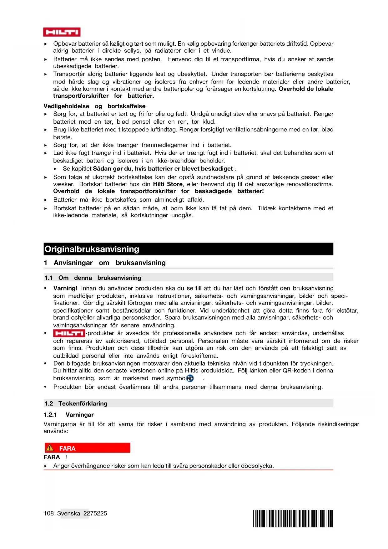 ▶ Observera följande säkerhetsanvisningar för säker hantering och användning av litiumjonbatterier. Om åtgärderna inte följs kan det leda till hudirritation, svåra frätskador, kemiska brännskador, bränder och/eller explosioner. ▶ Använd endast batterier som är fullt funktionsdugliga. ▶ Hantera batterierna varsamt för att undvika skador och läckage av hälsovådliga syror! ▶ Batterier får absolut inte modifieras eller manipuleras! ▶ Batterier får inte tas isär, klämmas, upphettas till mer än 80 °C (176 °F) eller brännas upp. ▶ Använd inte och ladda inte batterier som har utsatts för slag eller på annat sätt är skadade. Kontrollera batterierna regelbundet för att se om de uppvisar tecken på skador. ▶ Använd aldrig återvunna eller reparerade batterier. ▶ Använd aldrig batteriet eller ett batteridrivet elverktyg som slagverktyg. ▶ Utsätt aldrig batterierna för direkt solljus, förhöjda temperaturer, gnistor eller öppna lågor. Detta kan leda till explosioner. ▶ Rör inte batteripolerna med dina fingrar, verktyg, smycken eller andra elektriskt ledande föremål av metall. Detta kan skada batteriet och orsaka såväl materiella skador som personskador. ▶ Håll batterierna borta från regn, väta och vätskor. Fukt som tränger sig in kan orsaka kortslutningar, elstötar, brännskador och explosioner. ▶ Använd endast batteriladdare och elverktyg som är avsedda för denna typ av batteri. Läs också igenom uppgifterna i motsvarande bruksanvisning. ▶ Använd inte och förvara inte batteriet i explosionsfarliga miljöer.*2275225* 2275225 Svenska 111 ▶ Om batteriet är så hett att du inte kan ta i det kan det vara defekt. Ställ batteriet på en plats där inget riskerar att fatta eld och på betryggande avstånd från brännbart material. Låt batteriet svalna. Om batteriet efter en timme fortfarande är så hett att det inte går att ta i är det defekt. Kontakta Hilti-service eller läs dokumentet ”Säkerhetsanvisningar vid användning av Hilti litiumjonbatterier”. Följ de särskilda föreskrifter som gäller för transport, förvaring och användning av litiumjonbatterier. Läs säkerhetsanvisningarna för användning av Hilti litiumjonbatterier som du hittar genom att skanna QR-koden i slutet av denna bruksanvisning. 3 Beskrivning