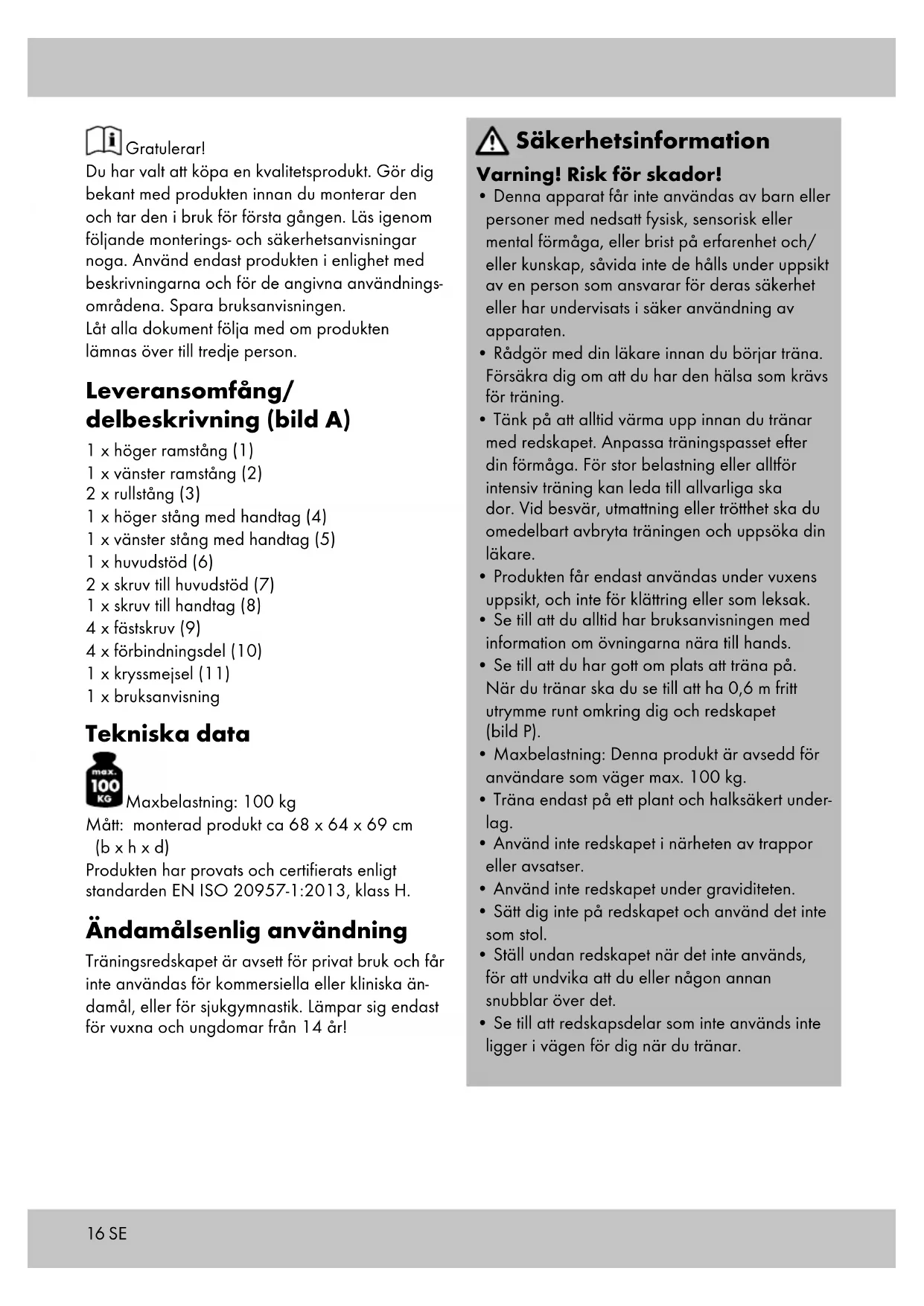 - Tänk på att alltid värma upp innan du tränar med redskapet. Anpassa träningspasset efter din förmåga. För stor belastning eller alltför intensiv träning kan leda till allvarliga ska dor. Vid besvär, utmattning eller trötthet ska du omedelbart avbryta träningen och uppsöka din läkare.