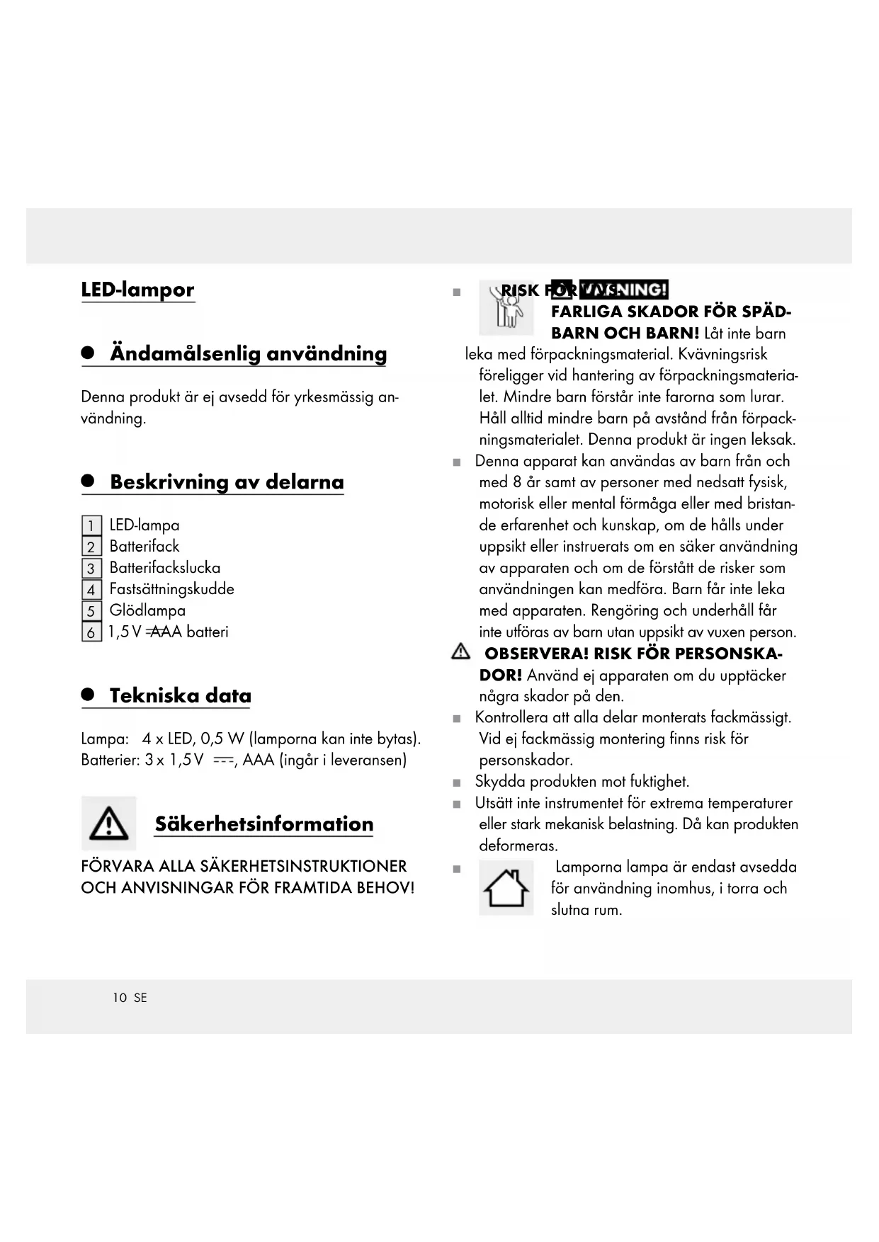 Lamporna lampa är endast avsedda för användning inomhus, i torra och slutna rum.11 SE Säkerhetsråd angående batterierna LIVSFARA! Batterier ska inte komma i händerna på barn. Låt inga batterier ligga utspridda. Det finns risk för att barn eller husdjur svälja dem. Skulle detta ändå hänt, uppsök genast läkare.