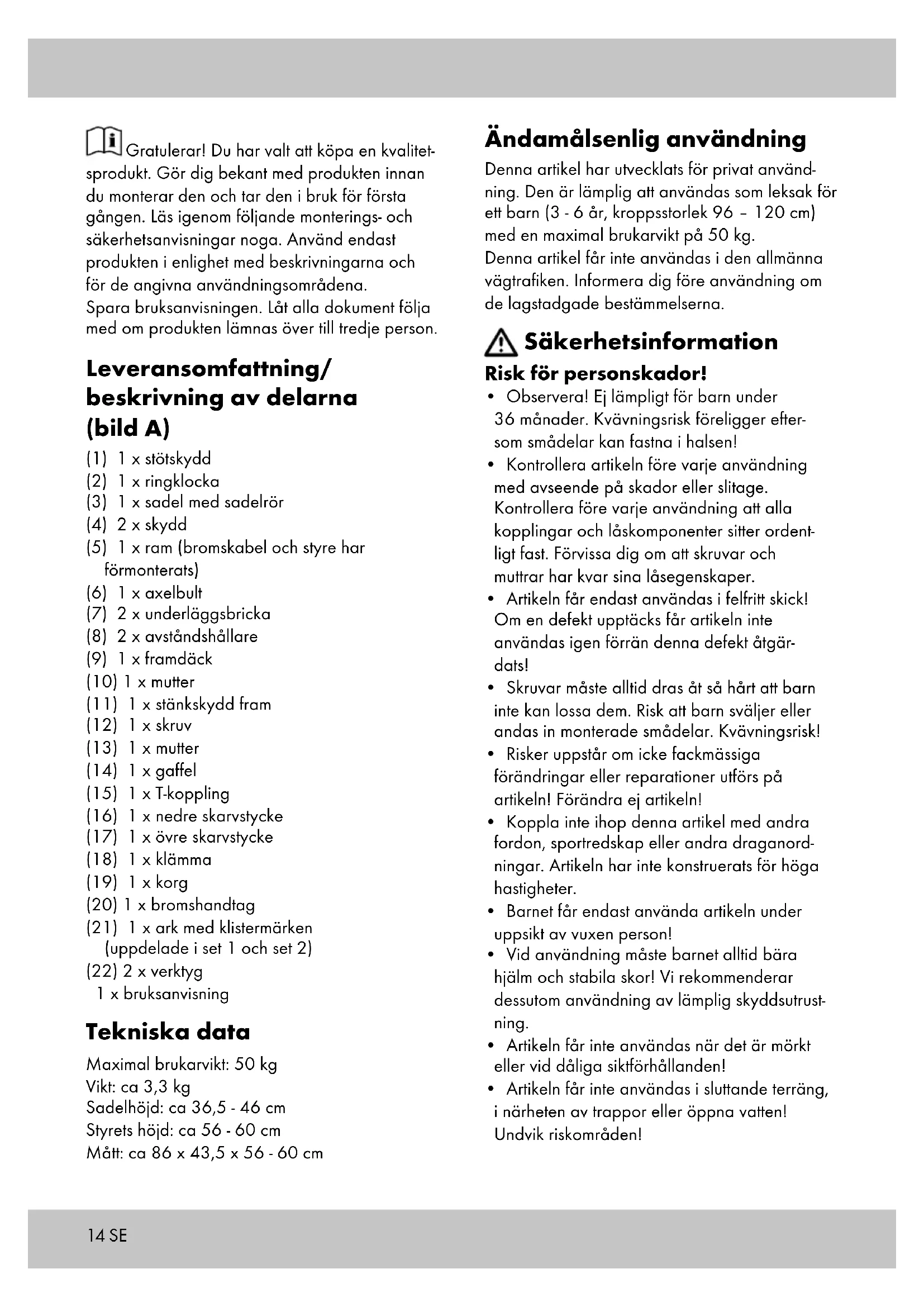 - Vid användning måste barnet alltid bära hjälm och stabila skor! Vi rekommenderar dessutom användning av lämplig skyddsutrust- ning.