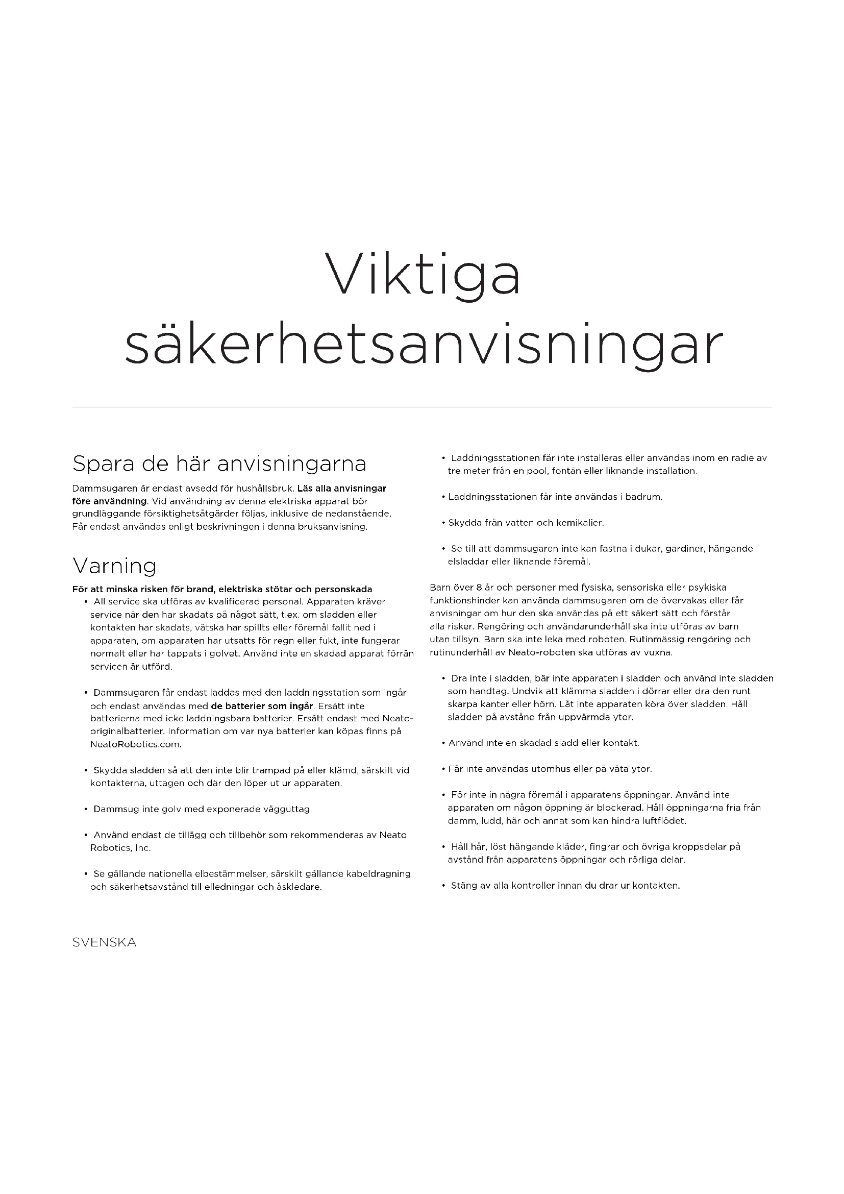 - Dammsugaren får endast laddas med den laddningsstation som ingår och endast användas med de batterier som ingår. Ersätt inte batterierna med icke laddningsbara batterier. Ersätt endast med Neato- originalbatterier. Information om var nya batterier kan köpas finns på NeatoRobotics.com.