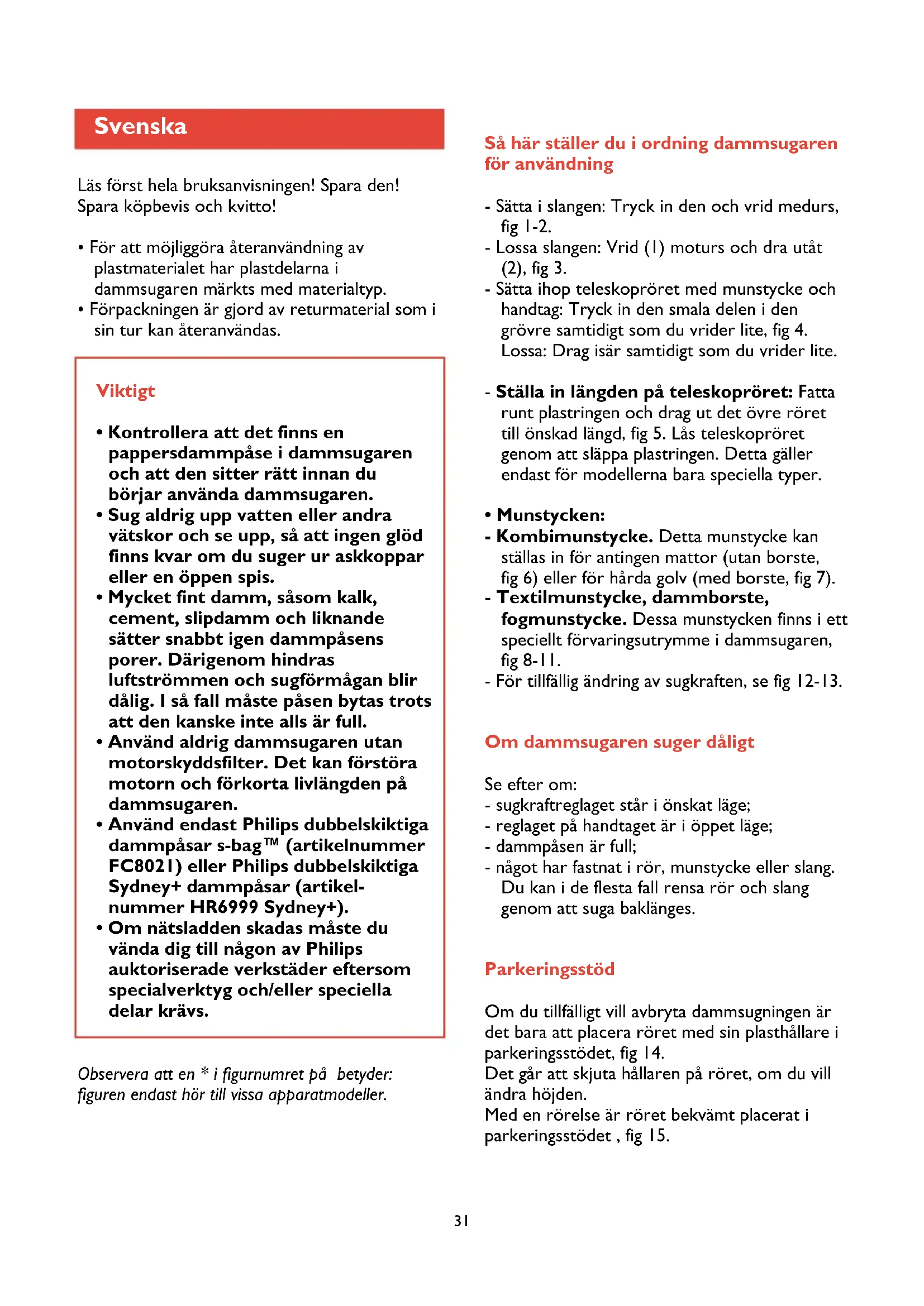 - Munstycken: - Kombimunstycke. Detta munstycke kan ställas in för antingen mattor (utan borste, fig 6) eller för hårda golv (med borste, fig 7). - Textilmunstycke, dammborste, fogmunstycke. Dessa munstycken finns i ett speciellt förvaringsutrymme i dammsugaren, fig 8-11. - För tillfällig ändring av sugkraften, se fig 12-13. Om dammsugaren suger dåligt Se efter om: - sugkraftreglaget står i önskat läge; - reglaget på handtaget är i öppet läge; - dammpåsen är full; - något har fastnat i rör, munstycke eller slang. Du kan i de flesta fall rensa rör och slang genom att suga baklänges. Parkeringsstöd Om du tillfälligt vill avbryta dammsugningen är det bara att placera röret med sin plasthållare i parkeringsstödet, fig 14. Det går att skjuta hållaren på röret, om du vill ändra höjden. Med en rörelse är röret bekvämt placerat i parkeringsstödet , fig 15. Läs först hela bruksanvisningen! Spara den! Spara köpbevis och kvitto!