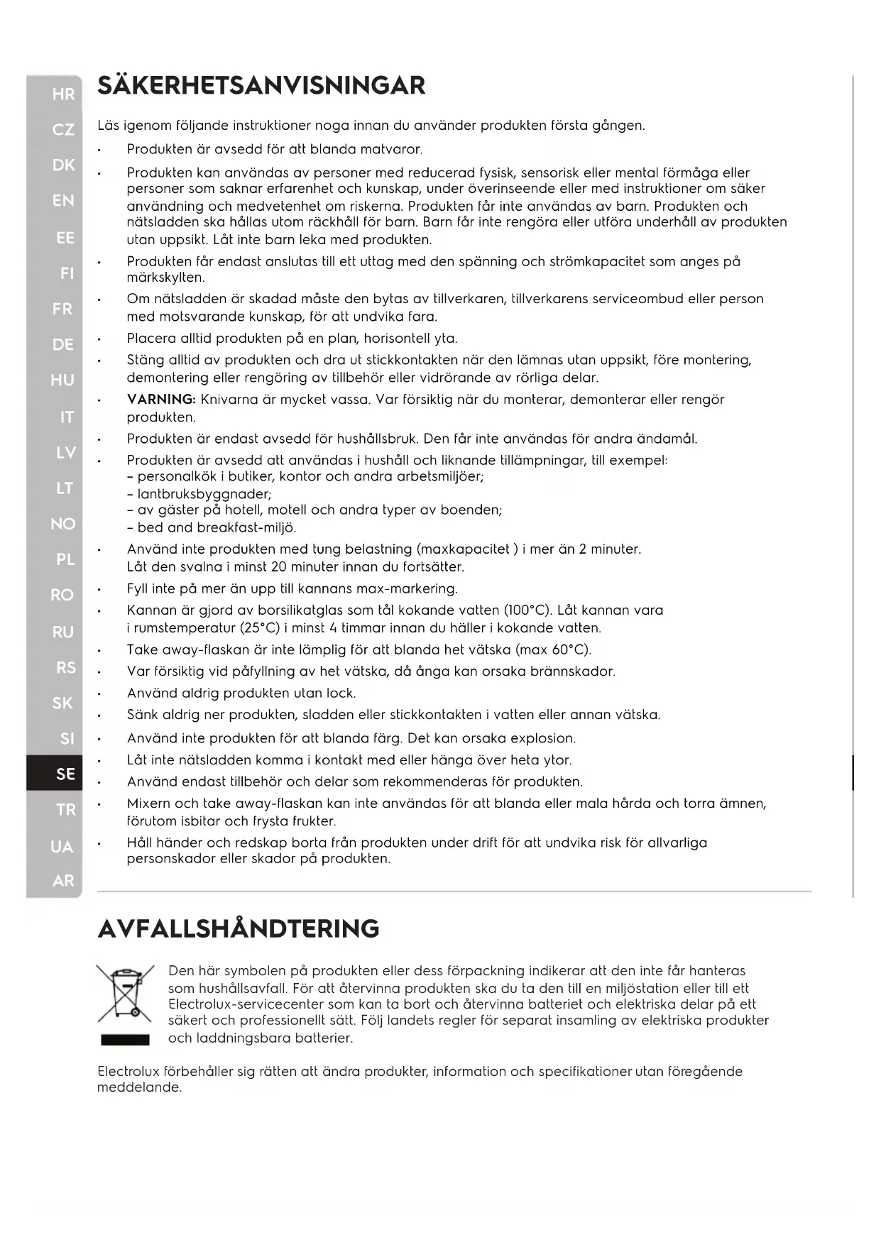 Produkten är avsedd för att blanda matvaror. Produkten kan användas av personer med reducerad fysisk, sensorisk eller mental förmåga eller personer som saknar erfarenhet och kunskap, under överinseende eller med instruktioner om säker användning och medvetenhet om riskerna. Produkten får inte användas av barn. Produkten och nätsladden ska hållas utom räckhåll för barn. Barn får inte rengöra eller utföra underhåll av produkten utan uppsikt. Låt inte barn leka med produkten. Produkten får endast anslutas till ett uttag med den spänning och strömkapacitet som anges på märkskylten. Om nätsladden är skadad måste den bytas av tillverkaren, tillverkarens serviceombud eller person med motsvarande kunskap, för att undvika fara. Placera alltid produkten på en plan, horisontell yta. Stäng alltid av produkten och dra ut stickkontakten när den lämnas utan uppsikt, före montering, demontering eller rengöring av tillbehör eller vidrörande av rörliga delar. VARNING: Knivarna är mycket vassa. Var försiktig när du monterar, demonterar eller rengör produkten. Produkten är endast avsedd för hushållsbruk. Den får inte användas för andra ändamål. Produkten är avsedd att användas i hushåll och liknande tillämpningar, till exempel: – personalkök i butiker, kontor och andra arbetsmiljöer; – lantbruksbyggnader; – av gäster på hotell, motell och andra typer av boenden; – bed and breakfast-miljö. Använd inte produkten med tung belastning (maxkapacitet ) i mer än 2 minuter. Låt den svalna i minst 20 minuter innan du fortsätter. Fyll inte på mer än upp till kannans max-markering. Kannan är gjord av borsilikatglas som tål kokande vatten (100°C). Låt kannan vara i rumstemperatur (25°C) i minst 4 timmar innan du häller i kokande vatten. Take away-flaskan är inte lämplig för att blanda het vätska (max 60°C). Var försiktig vid påfyllning av het vätska, då ånga kan orsaka brännskador. Använd aldrig produkten utan lock. Sänk aldrig ner produkten, sladden eller stickkontakten i vatten eller annan vätska. Använd inte produkten för att blanda färg. Det kan orsaka explosion. Låt inte nätsladden komma i kontakt med eller hänga över heta ytor. Använd endast tillbehör och delar som rekommenderas för produkten. Mixern och take away-flaskan kan inte användas för att blanda eller mala hårda och torra ämnen, förutom isbitar och frysta frukter. Håll händer och redskap borta från produkten under drift för att undvika risk för allvarliga personskador eller skador på produkten.HR