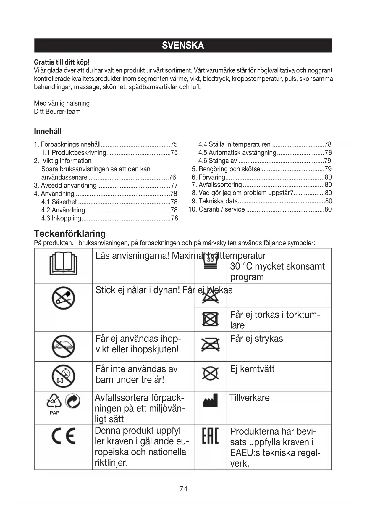 Innehåll Grattis till ditt köp! Vi är glada över att du har valt en produkt ur vårt sortiment. Vårt varumärke står för högkvalitativa och noggrant kontrollerade kvalitetsprodukter inom segmenten värme, vikt, blodtryck, kroppstemperatur, puls, skonsamma behandlingar, massage, skönhet, spädbarnsartiklar och luft. Med vänlig hälsning Ditt Beurer-team75 Apparat med skydds- klass2 Avfallshantera produkten enligt EG-direktivet om avfall som utgörs av eller innehåller elektriska eller elektroniska produkter – WEEE (Waste Electrical and Electronic Equipme
