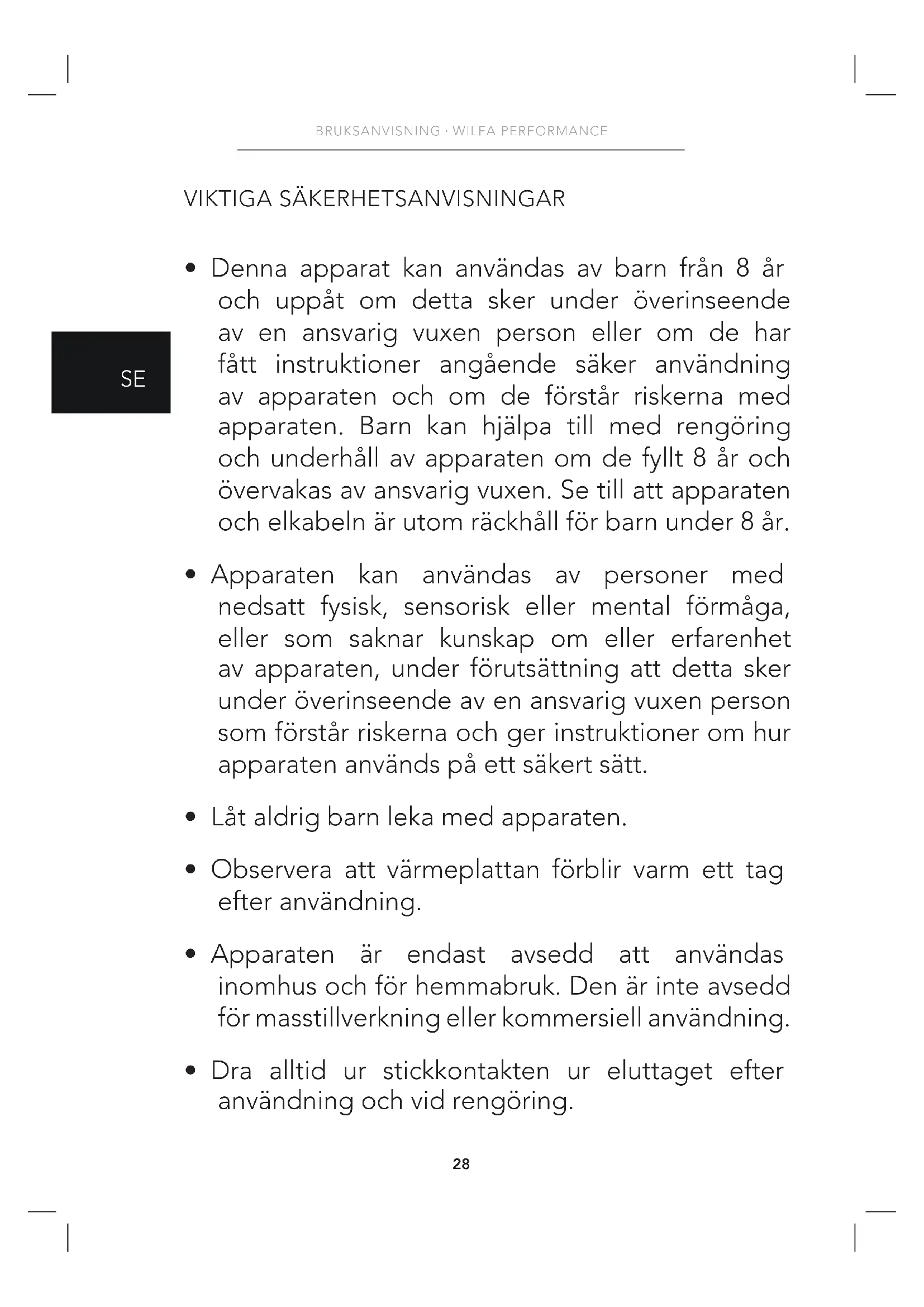 - Denna apparat kan användas av barn från 8 år och uppåt om detta sker under överinseende av en ansvarig vuxen person eller om de har fått instruktioner angående säker användning av apparaten och om de förstår riskerna med apparaten. Barn kan hjälpa till med rengöring och underhåll av apparaten om de fyllt 8 år och övervakas av ansvarig vuxen. Se till att apparaten och elkabeln är utom räckhåll för barn under 8 år.
