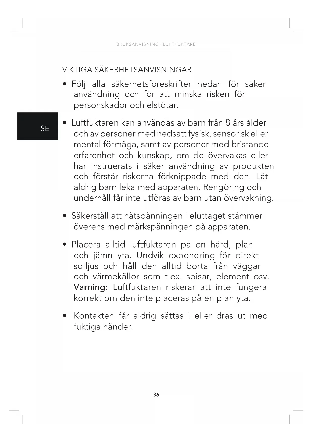 - Luftfuktaren kan användas av barn från 8 års ålder och av personer med nedsatt fysisk, sensorisk eller mental förmåga, samt av personer med bristande erfarenhet och kunskap, om de övervakas eller har instruerats i säker användning av produkten och förstår riskerna förknippade med den. Låt aldrig barn leka med apparaten. Rengöring och underhåll får inte utföras av barn utan övervakning.