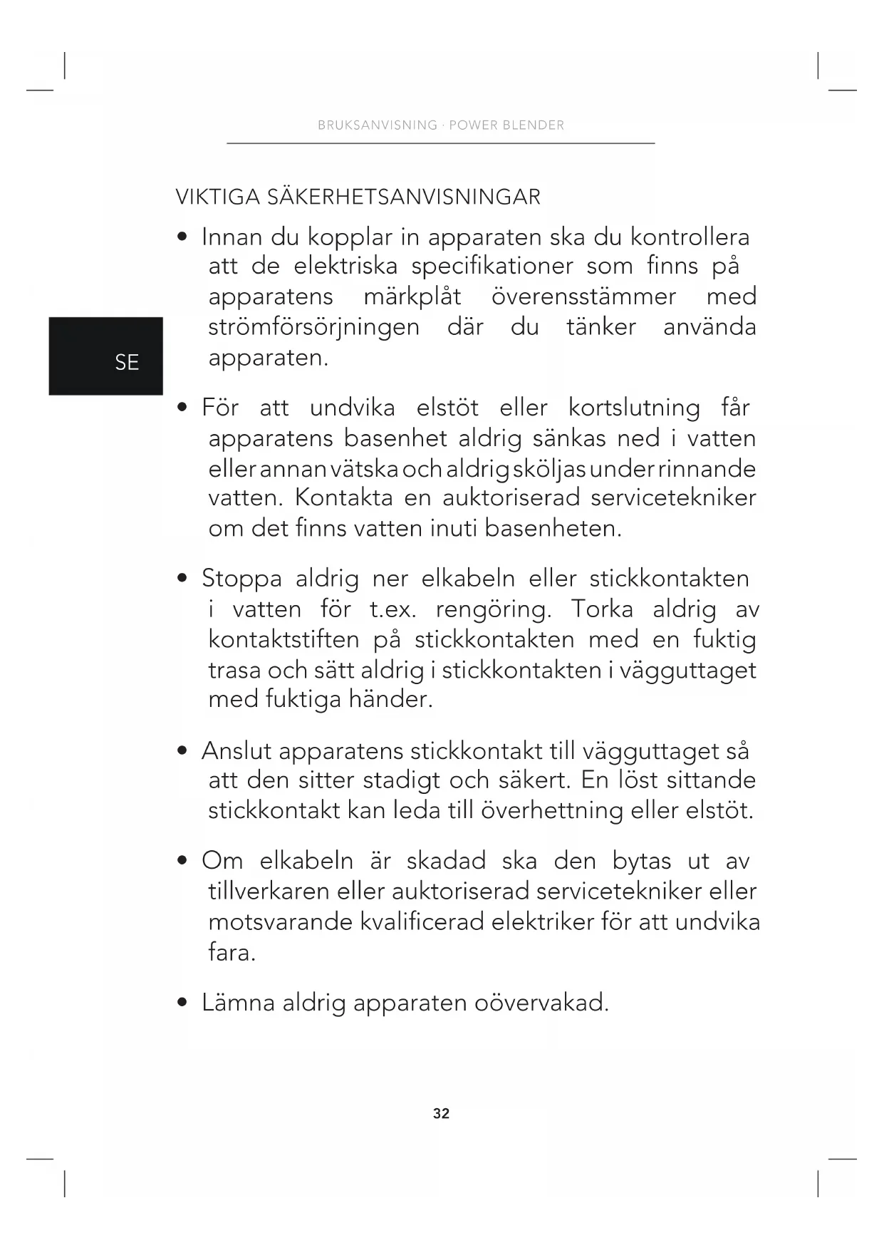 - Stoppa aldrig ner elkabeln eller stickkontakten i vatten för t.ex. rengöring. Torka aldrig av kontaktstiften på stickkontakten med en fuktig trasa och sätt aldrig i stickkontakten i vägguttaget med fuktiga händer.