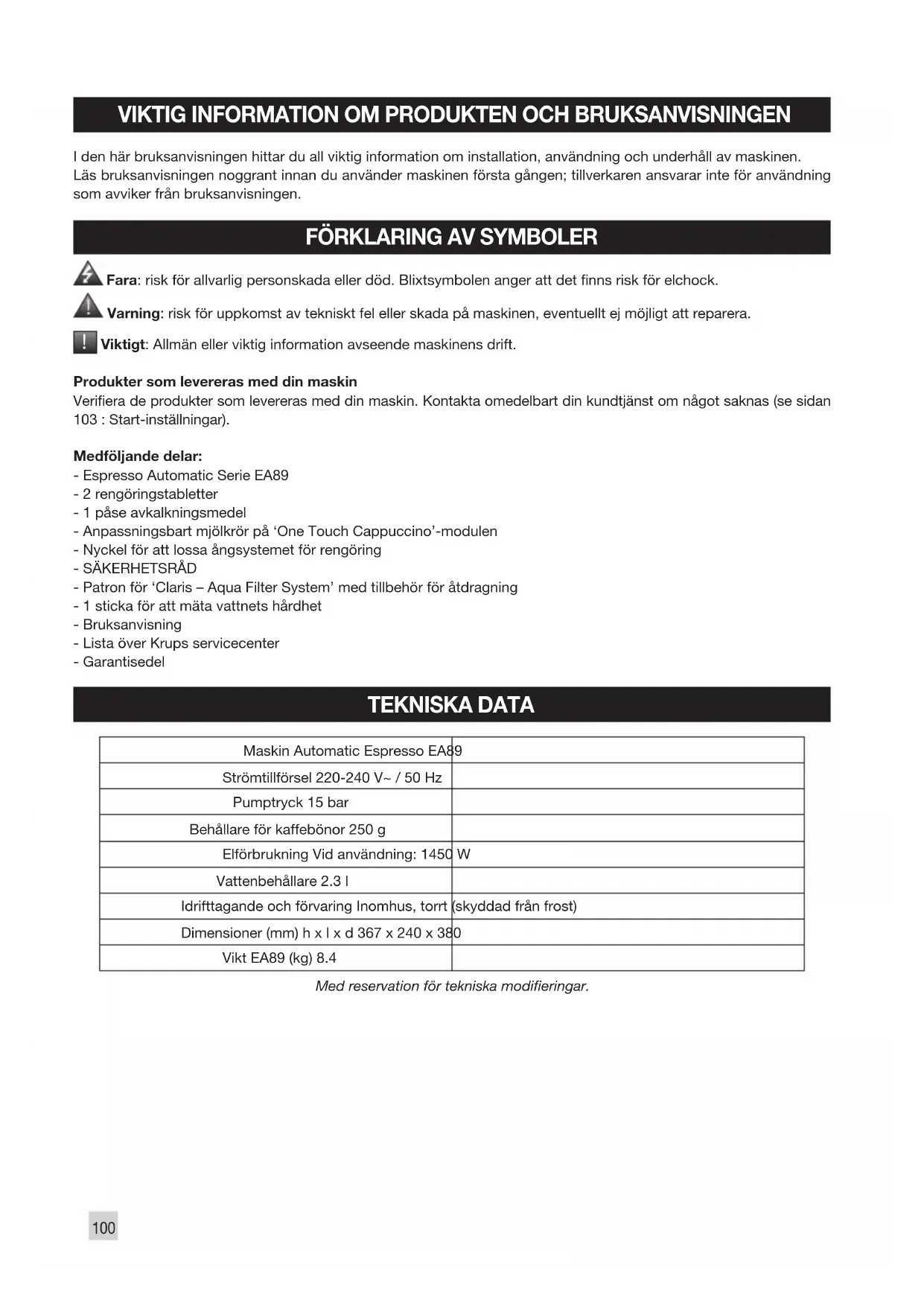 - Patron för ‘Claris – Aqua Filter System’ med tillbehör för åtdragning - 1 sticka för att mäta vattnets hårdhet - Bruksanvisning - Lista över Krups servicecenter - Garantisedel TEKNISKA DATA Maskin Automatic Espresso EA89 Strömtillförsel 220-240 V~ / 50 Hz Pumptryck 15 bar Behållare för kaffebönor 250 g Elförbrukning Vid användning: 1450 W Vattenbehållare 2.3 l Idrifttagande och förvaring Inomhus, torrt (skyddad från frost) Dimensioner (mm) h x l x d 367 x 240 x 380 Vikt EA89 (kg) 8.4 Med reservation för tekniska modieringar.BESKRIVNING A Lock med handtag till vattenbehållarenB VattenbehållareC Uppsamlingskärl för sumpD Kaffemunstycke, justerbart i höjdledE Löstagbart galler och droppbrickaF Lock till behållare för kaffebönorG Löstagbar ‘One Touch Cappuccino’-modulG1 Demonteringsnyckel för rengöring av ångkretsenG2 Enkel-touch cappuccino-blockH Mjölkrör och blandareI Flottör för att indikera vattennivå Behållare för kaffebönorJ Knapp för inställning av malning nt-grovtK Fack för rengöringstablettL Kaffekvarn i metall KontrollpanelM DisplayN PÅ/AV-knappO TouchknapparMer information: Droppbrickan samlar upp vatten och kaffe som rinner över under eller efter bryggningen. Det är viktigt att den alltid är på plats och regelbundet rengörs och töms.