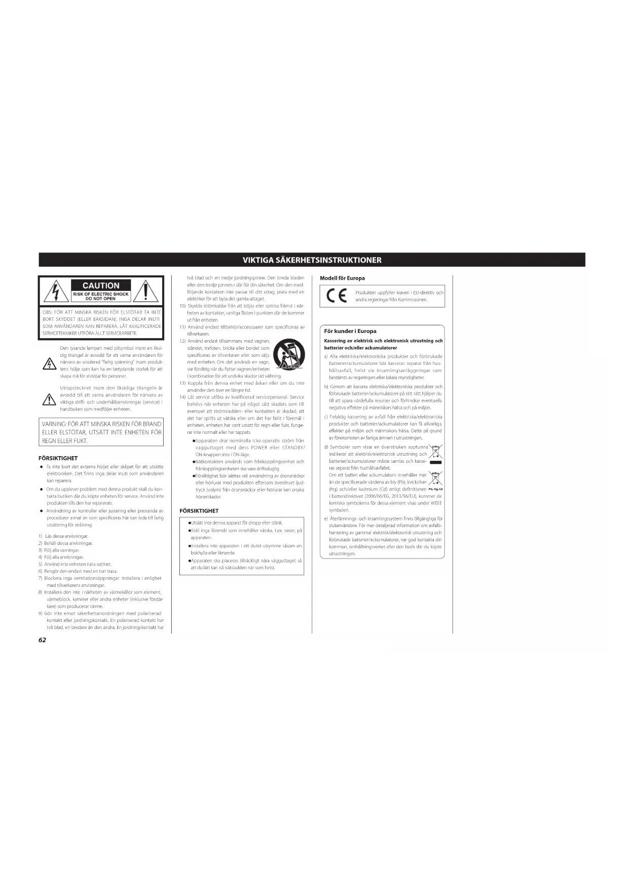 OBS: FÖR ATT MINSKA RISKEN FÖR ELSTÖTAR TA INTE BORT SKYDDET (ELLER BAKSIDAN). INGA DELAR INUTI SOM ANVÄNDAREN KAN REPARERA. LÅT KVALIFICERADE SERVICETEKNIKER UTFÖRA ALLT SERVICEARBETE. Den lysande lampan med pilsymbol inom en liksi-dig triangel är avsedd för att varna användaren för närvaro av oisolerad ”farlig spänning” inom produk-tens hölje som kan ha en betydande storlek för att skapa risk för elstötar för personer. Utropstecknet inom den liksidiga triangeln är avsedd till att varna användaren för närvaro av viktiga drift- och underhållsanvisningar (service) i handboken som medföljer enheten. VARNING: FÖR ATT MINSKA RISKEN FÖR BRAND ELLER ELSTÖTAR, UTSÄTT INTE ENHETEN FÖR REGN ELLER FUKT. FÖRSIKTIGHET o Ta inte bort det externa höljet eller skåpet för att utsätta elektroniken. Det finns inga delar inuti som användaren kan reparera. o Om du upplever problem med denna produkt skall du kon- takta butiken där du köpte enheten för service. Använd inte produkten tills den har reparerats. o Användning av kontroller eller justering eller prestanda av procedurer annat än som specificeras här kan leda till farlig utsättning för strålning.1) Läs dessa anvisningar.2) Behåll dessa anvisningar.3) Följ alla varningar.4) Följ alla anvisningar.5) Använd inte enheten nära vattnet.6) Rengör den endast med en torr trasa.7) Blockera inga ventilationsöppningar. Installera i enlighet med tillverkarens anvisningar.8) Installera den inte i närheten av värmekällor som element, värmeblock, kaminer eller andra enheter (inklusive förstär-kare) som producerar värme.9) Gör inte emot säkerhetsanordningen med polariserad kontakt eller jordningskontakt. En polariserad kontakt har två blad, en bredare än den andra. En jordningskontakt har två blad och en tredje jordningspinne. Den breda bladen eller den tredje pinnen r där för din säkerhet. Om den med-följande kontakten inte passar till ditt uttag, prata med en elektriker för att byta det gamla uttaget.10) Skydda strömkablar från att böjas eller spricka främst i när-heten av kontakter, vanliga fästen i punkten där de kommer ut från enheten.11) Använd endast tillbehör/accessoarer som specificeras av tillverkaren.12) Använd endast tillsammans med vagnen, ståndet, trefoten, bricka eller bordet som specificeras av tillverkaren eller som säljs med enheten. Om det används en vagn, var försiktig när du flyttar vagnen/enheten i kombination för att undvika skador vid vältning.13) Koppla från denna enhet med åskan eller om du inte använder den över en längre tid.14) Låt service utföra av kvalificerad servicepersonal. Service behövs när enheten har på något sätt skadats som till exempel att strömsladden- eller kontakten är skadad, att det har spillts ut vätska eller om det har fallit i föremål i enheten, enheten har varit utsatt för regn eller fukt, funge-rar inte normalt eller har tappats. o Apparaten drar nominella icke-operativ ström från vägguttaget med dess POWER eller STANDBY/ON-knappen inte i ON-läge. o Nätkontakten används som frånkopplingsenhet och frånkopplingsenheten ska vara driftsduglig. o Försiktighet bör iakttas vid användning av öronsnäckor eller hörlurar med produkten eftersom överdrivet ljud-tryck (volym) från öronsnäckor eller hörlurar kan orsaka hörselskador. FÖRSIKTIGHET o Utsätt inte denna apparat för dropp eller stänk. o Ställ inga föremål som innehåller vätska, t.ex. vaser, på apparaten. o Installera inte apparaten i ett slutet utrymme såsom en bokhylla eller liknande. o Apparaten ska placeras tillräckligt nära vägguttaget så att du lätt kan nå nätsladden när som helst.Modell för EuropaProdukten uppfyller kraven i EU-direktiv och andra regleringar från Kommissionen. För kunder i Europa Kassering av elektrisk och elektronisk utrustning och batterier och/eller ackumulatorera) Alla elektriska/elektroniska produkter och förbrukade batterier/ackumulatorer bör kasseras separat från hus-hållsavfall, helst via insamlingsanläggningar som bestämts av regeringen eller lokala myndigheter.b) Genom att kassera elektriska/elektroniska produkter och förbrukade batterier/ackumulatorer på rätt sätt hjälper du till att spara värdefulla resurser och förhindrar eventuella negativa effekter på människors hälsa och på miljön.c) Felaktig kassering av avfall från elektriska/elektroniska produkter och batterier/ackumulatorer kan få allvarliga effekter på miljön och människors hälsa. Detta på grund av förekomsten av farliga ämnen i utrustningen.d) Symboler som visar en överstruken soptunna indikerar att elektrisk/elektronisk utrustning och batterier/ackumulatorer måste samlas och kasse-ras separat från hushållsavfallet.Om ett batteri eller ackumulatorn innehåller mer än de specificerade värdena av bly (Pb), kvicksilver (Hg) och/eller kadmium (Cd) enligt definitionen i batteridirektivet (2006/66/EG, 2013/56/EU), kommer de kemiska symbolerna för dessa element visas under WEEE symbolen.e) Återlämnings- och insamlingssystem finns tillgängliga för slutanvändare. För mer detaljerad information om avfalls-hantering av gammal elektrisk/elektronisk utrustning och förbrukade batterier/ackumulatorer, var god kontakta din kommun, renhållningsverket eller den butik där du köpte utrustningen. Pb, Hg, Cd 62SVENSKA Före användning Underhåll Om enhetens yta blir smutsig, torka av den med en mjuk trasa eller använd utspädd och mild, flytande tvål. Låt enhetens yta torka helt innan du använder enheten. o Använd inte kemiska rengöringstrasor, förtunnare eller lik- nande ämnen, eftersom de kan skada enhetens yta.