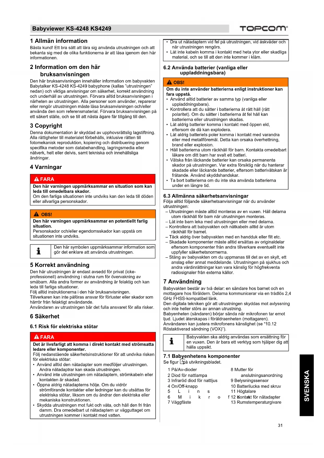 SVENSKA 1 Allmän information Bästa kund! Ett bra sätt att lära sig använda utrustningen och att bekanta sig med de olika funktionerna är att läsa igenom den här informationen. 2 Information om den här bruksanvisningen Den här bruksanvisningen innehåller information om babyvakten Babytalker KS-4248 KS-4249 babyphone (kallas ”utrustningen” nedan) och viktiga anvisningar om säkerhet, korrekt användning och underhåll av utrustningen. Förvara alltid bruksanvisningen i närheten av utrustningen. Alla personer som använder, reparerar eller rengör utrustningen måste läsa bruksanvisningen och/eller använda den som referensmaterial. Förvara bruksanvisningen på ett säkert ställe, och se till att nästa ägare får tillgång till den. 3 Copyright Denna dokumentation är skyddad av upphovsrättslig lagstiftning.Alla rättigheter till materialet förbehålls, inklusive rätten till fotomekanisk reproduktion, kopiering och distribuering genom specifika metoder som databehandling, lagringsmedia eller nätverk, helt eller delvis, samt tekniska och innehållsliga ändringar. 4 Varningar 5 Korrekt användning Den här utrustningen är endast avsedd för privat (icke-professionell) användning i slutna rum för övervakning av småbarn. Alla andra former av användning är felaktig och kan leda till farliga situationer.Följ alltid instruktionerna i den här bruksanvisningen.Tillverkaren kan inte påföras ansvar för förluster eller skador som härrör från felaktigt användande.Användaren av utrustningen bär det fulla ansvaret för alla risker. 6 Säkerhet