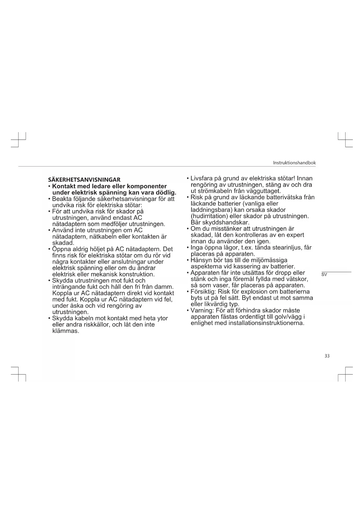 - Varning: För att förhindra skador måste apparaten fästas ordentligt till golv/vägg i enlighet med installationsinstruktionerna. SVInstruktionshandbok