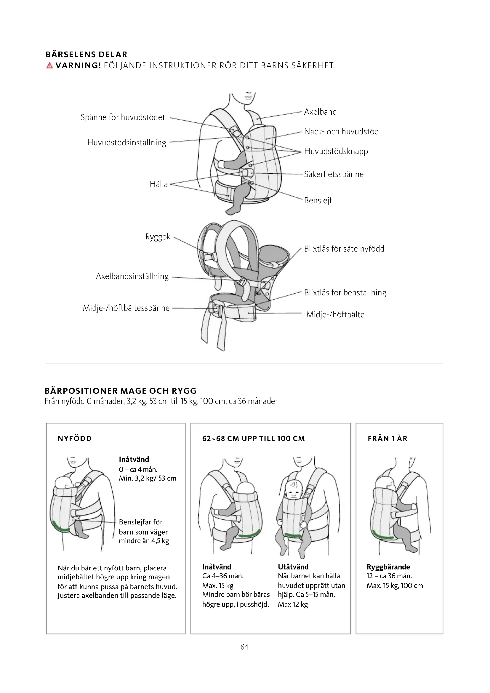 Från nyfödd 0 månader, 3,2 kg, 53 cm till 15 kg, 100 cm, ca 36 månader Utåtvänd När barnet kan hålla huvudet upprätt utan hjälp. Ca 5–15 mån. Max 12 kg Ryggbärande 12 – ca 36 mån. Max. 15 kg, 100 cm Inåtvänd Ca 4–36 mån. Max. 15 kg Mindre barn bör bäras högre upp, i pusshöjd. Spänne för huvudstödet Hälla Axelband Nack- och huvudstöd Huvudstödsknapp Säkerhetsspänne Benslejf Ryggok Midje-/höftbältesspänne Axelbandsinställning Blixtlås för benställning Midje-/höftbälte Blixtlås för säte nyfödd Huvudstödsinställning NYFÖDD När du bär ett nyfött barn, placera midjebältet högre upp kring magen för att kunna pussa på barnets huvud. Justera axelbanden till passande läge. Inåtvänd 0 – ca 4 mån. Min. 3,2 kg/ 53 cm Benslejfar för barn som väger mindre än 4,5 kg