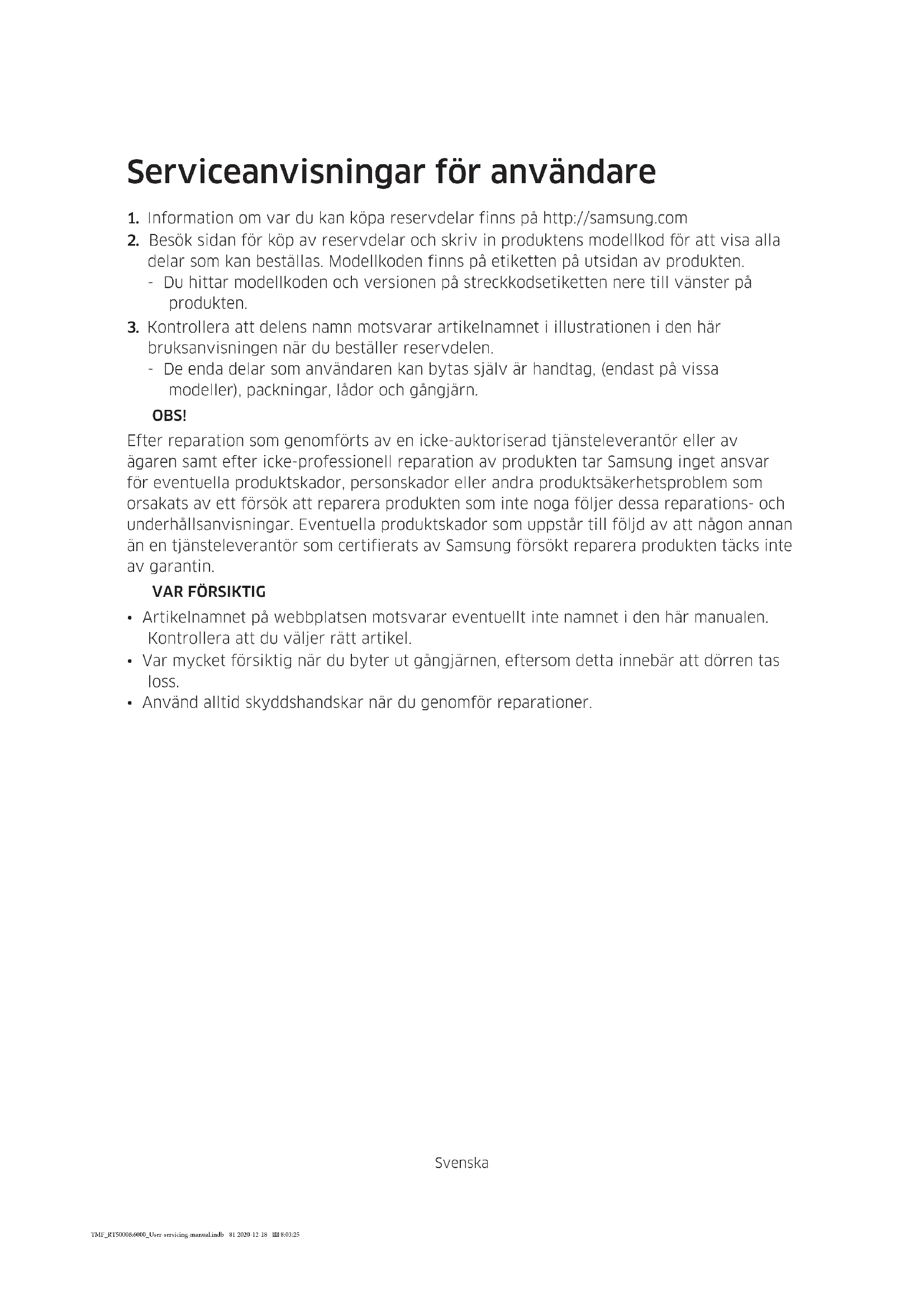 bruksanvisningen när du beställer reservdelen. - De enda delar som användaren kan bytas själv är handtag, (endast på vissa modeller), packningar, lådor och gångjärn. OBS! Efter reparation som genomförts av en icke-auktoriserad tjänsteleverantör eller av ägaren samt efter icke-professionell reparation av produkten tar Samsung inget ansvar för eventuella produktskador, personskador eller andra produktsäkerhetsproblem som orsakats av ett försök att reparera produkten som inte noga följer dessa reparations- och underhållsanvisningar. Eventuella produktskador som uppstår till följd av att någon annan än en tjänsteleverantör som certifierats av Samsung försökt reparera produkten täcks inte av garantin.