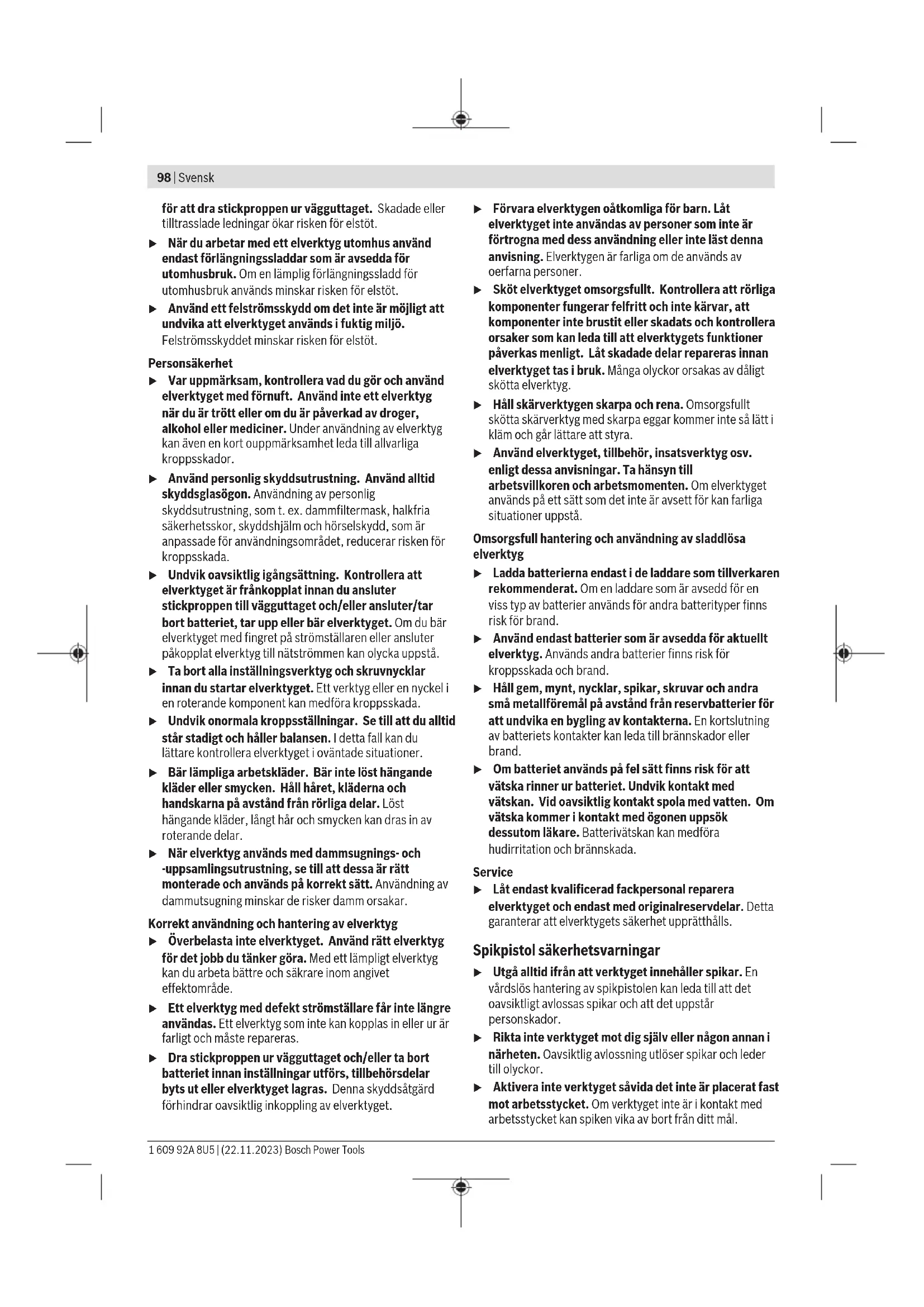 1,5 1,5 1,5 Den vibrationsnivå och det bullervärde som anges i dessa anvisningar har uppmätts enligt en mätmetod som normerats och kan användas för att jämföra elverktyg med varandra. Mätmetoden är även lämplig för preliminär bedömning av vibrations- och bullernivån. Den angivna vibrations- och bullernivån representerar den huvudsakliga användningen av elverktyget. Om däremot elverktyget används för andra ändamål, med andra insatsverktyg eller inte underhållits ordentligt kan vibrations- och bullernivån avvika. Då kan vibrations- och bullernivån under arbetsperioden öka betydligt under hela arbetstiden. För en exakt bedömning av vibrations- och bullernivån bör även de tider beaktas när elverktyget är avstängt eller är igång, men inte används. Detta reducerar vibrations- och bullerbelastningen för den totala arbetsperioden betydligt. Bestäm extra säkerhetsåtgärder för att skydda operatören mot vibrationernas inverkan t.ex.: underhåll av elverktyget och insatsverktygen, att hålla händerna varma, organisation av arbetsförloppen. Batteri u Ta bort batteriet ur elverktyget innan åtgärder utförs på elverktyget (t.ex. underhåll, verktygsbyte) samt före transport och lagring. Om strömställaren Till/Från oavsiktligt påverkas finns risk för personskada. Bosch säljer batteridrivna elverktyg även utan batteri. Om det ingår ett batteri i leveransen av ditt elverktyg kan du se på förpackningen. Ladda batteriet u Använd endast de laddare som anges i tekniska data. Endast denna typ av laddare är anpassad till det litium- jonbatteri som används i elverktyget. Observera: litiumjonbatterier levereras delvis laddade enligt internationella transportföreskrifter. För full effekt ska batteriet laddas helt innan första användningen. Sätta in batteriet Skjut in det laddade batteriet i batterihållaren tills det sitter fast. Borttagning av batteri För att ta ut batteriet, tryck på upplåsningsknappen och dra ut batteriet. Bruka inte våld. Batteriet är försedd med två låssteg som hindrar ackumulatorn från att falla ut om dess upplåsningsknappfaller ut. När batteriet är insatt i elverktyget hålls det med en fjäder i rätt läge. Indikering batteristatus Observera: Inte varje batterityp har en laddningsindikation. De tre gröna LED-lamporna på indikeringen för batteristatus visar batteriets laddningsnivå. Av säkerhetsskäl kan man endast kontrollera batteristatus när elverktyget är stilla. Tryck på knappen för indikering av batteristatus eller , för att visa batteriets laddningsnivå. Detta är möjligt även då batteriet är uttaget. Om ingen LED-lampa lyser efter ett tryck på knappen för batteristatus är batteriet defekt och måste bytas ut. Batteriets laddningsstatus visas även i användargränssnittet (se „Statusindikeringar“, Sidan103). Batterityp GBA 18V... LED Kapacitet Fast ljus 3× grönt 60–100% Fast ljus 2× grönt 30–60% Fast ljus 1× grönt 5–30% Blinkande ljus 1× grönt 0–5% Batterityp ProCORE18V... LED Kapacitet Fast ljus 5× grönt 80–100% Fast ljus 4× grönt 60–80% Fast ljus 3× grönt 40–60% Bosch Power Tools 1 609 92A 8U5 | (22.11.2023)102 | Svensk LED Kapacitet Fast ljus 2× grönt 20–40% Fast ljus 1× grönt 5–20% Blinkande ljus 1× grönt 0–5% Anvisningar för korrekt hantering av batterimodulen Skydda batterimodulen mot fukt och vatten. Batteriet får endast lagras inom ett temperaturområde mellan –20 °C till 50 °C. Låt därför inte batterimodulen t. ex. på sommaren ligga kvar i bilen. Rengör vid tillfälle batterimodulens ventilationsöppningar med en mjuk, ren och torr pensel. Är brukstiden efter uppladdning onormalt kort tyder det på att batterierna är förbrukade och måste bytas mot nya. Beakta anvisningarna för avfallshantering. Montering u Ta bort batteriet ur elverktyget innan åtgärder utförs på elverktyget (t.ex. underhåll, verktygsbyte) samt före transport och lagring. Om strömställaren Till/Från oavsiktligt påverkas finns risk för personskada. Fylla på magasinet (sebildA1–A4) u Ta bort batteriet innan du gör inställningar på apparaten, byter tillbehörsdelar eller lägger undan elverktyget. Denna skyddsåtgärd förhindrar oavsiktlig start av elverktyget. Använd endast originalBosch-tillbehör. Elverktygets precisionsdelar, som magasin, mynning och kanal är anpassade till klamrar, spikar och stift från Bosch. Andra tillverkare använder andra stålkvaliteter och dimensioner. Observera: använd endast indrivningsmaterial som specificeras i tabellen ”Tekniska data”. Användning av otillåtet material kan skada elverktyget och orsaka personskador. Medan du fyller på magasinet, håll elverktyget så att mynningen (18) inte är riktad mot dig eller någon annan. – Rengör magasinförskjutaren (15) vid behov och se till att magasinet (14) inte är smutsigt. – Skjut in passande spikremsa (20) i T-slitsen i änden av magasinet (14). – Skjut in spikremsan i magasinet tills den sista spiken ligger framför magasinfjädern (21). Observera: en elektronisk sensor känner av om det finns spikar i magasinet. Om utlösningssäkringen trycks in vid tomt magasin utlöser ingen indrivning. Därmed förhindras tomma skott. – Tryck den spända spikmedbringaren (16) mot magasinförskjutaren (15) och dra samtidigt magasinskjutaren helt till änden av magasinet (14). Observera: magasinförskjutaren måste kunna skjutas tillbaka utan stor kraft (för hand). En magasinförskjutare som sitter fast kan orsaka följande: spikarna skjuts inte ut, utan fastnar i utskjutningskanalen (se blockering) eller spikarna skjuts ut i fel vinkel. – För försiktigt magasinförskjutaren (15) framåt med intryckt spikmedbringare (16) tills spikmedbringaren har skjutits över den sista spiken och skjut därefter spikremsan hela vägen fram i magasinet. Observera: låt inte magasinförskjutaren snäppa tillbaka fritt. Den kan bli skadad och du kan klämma 